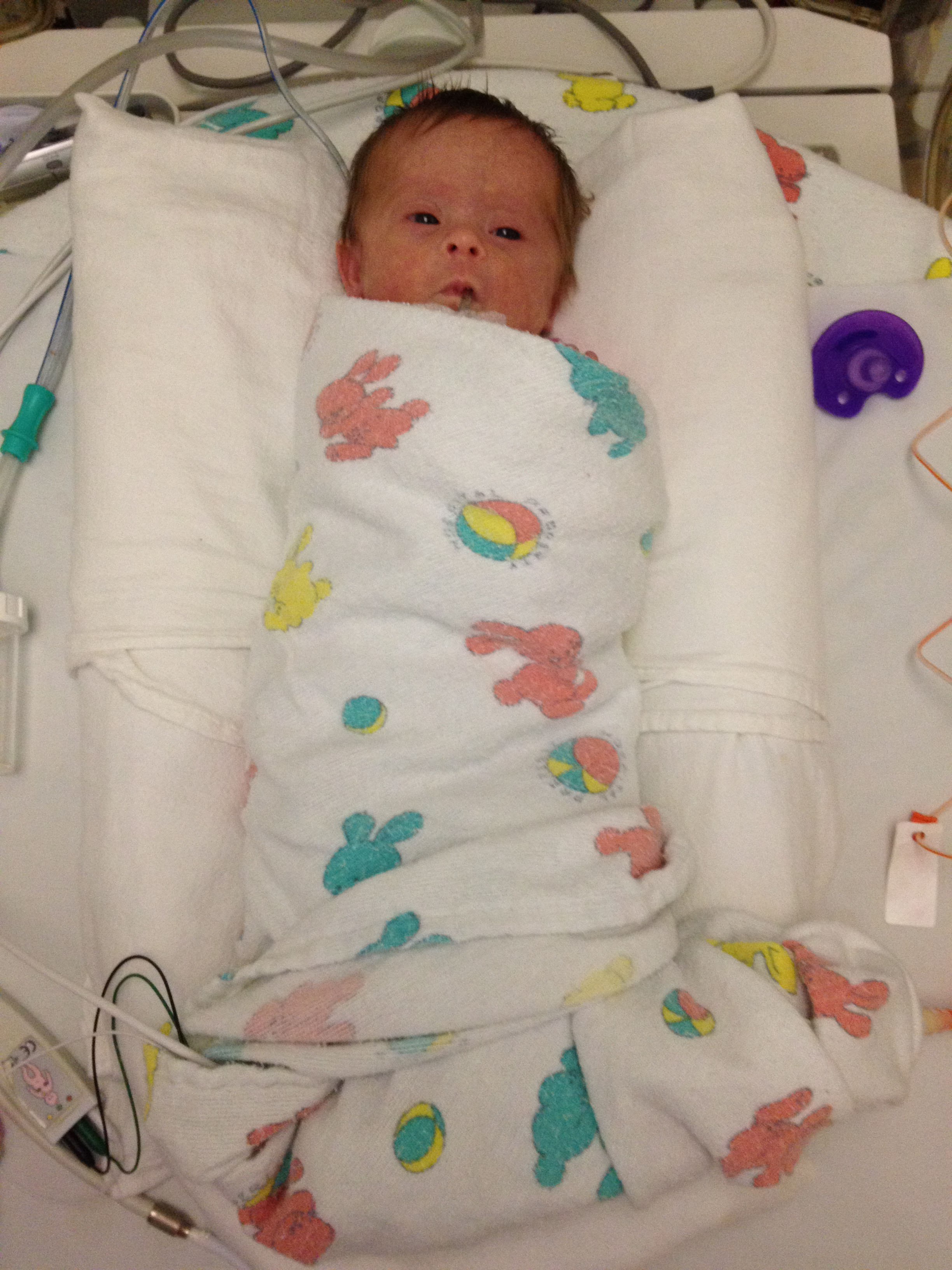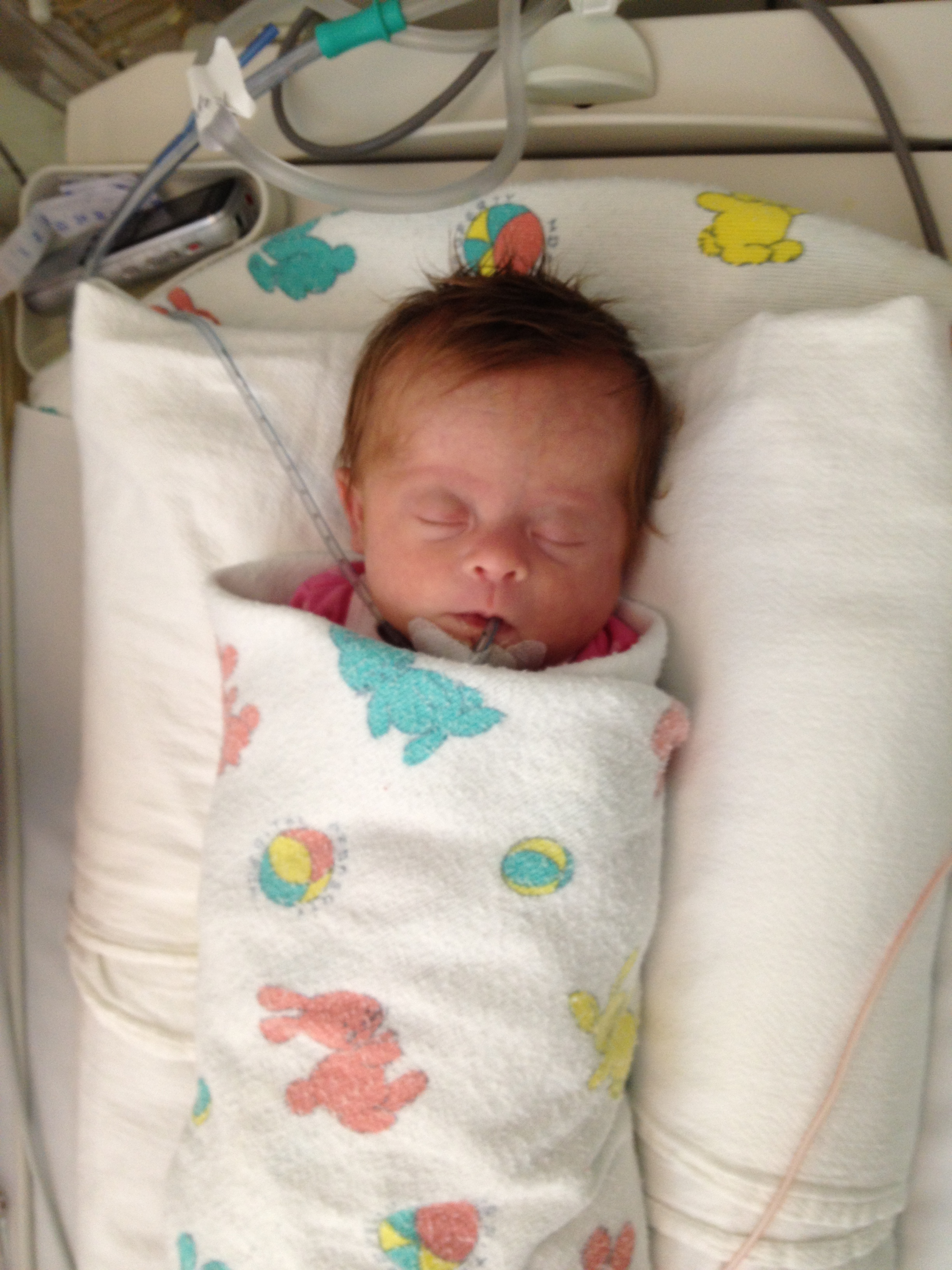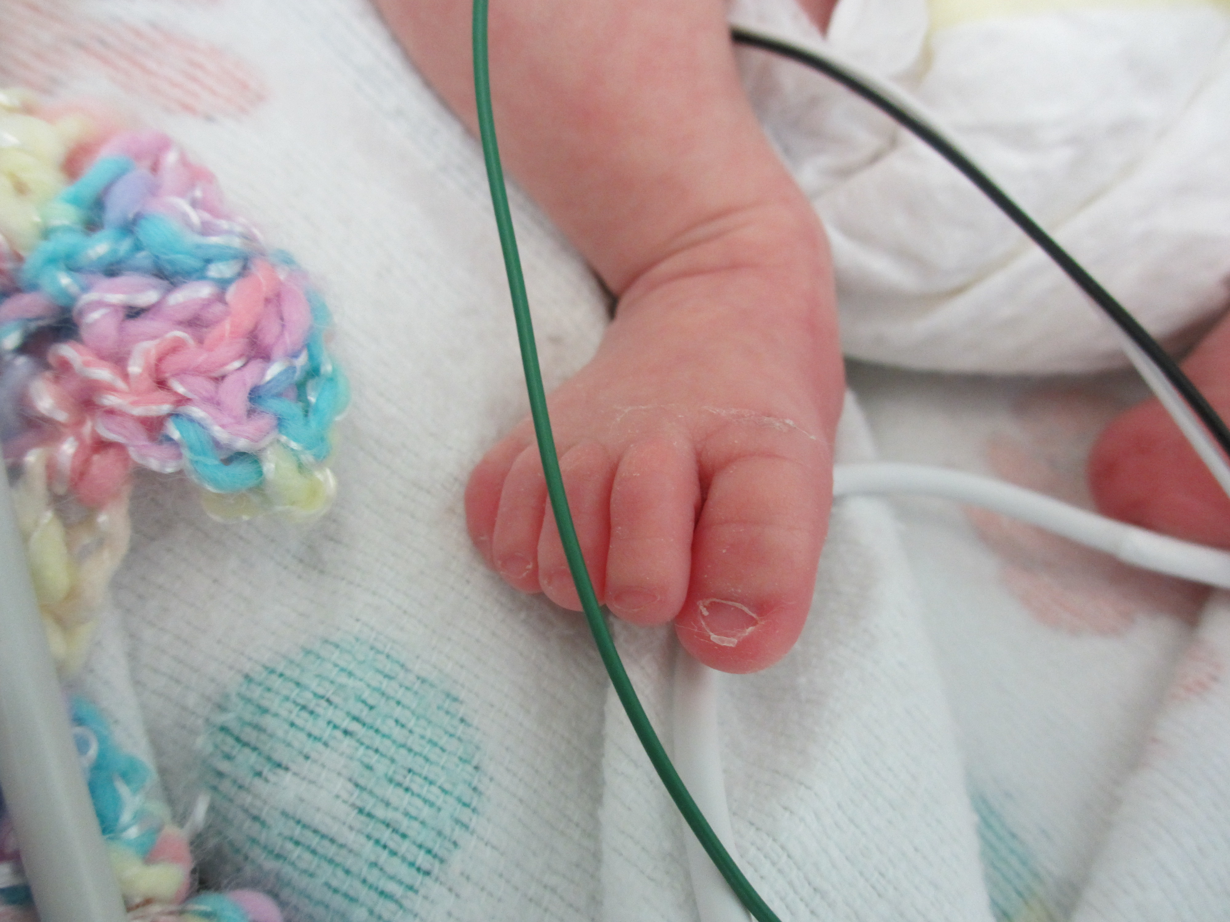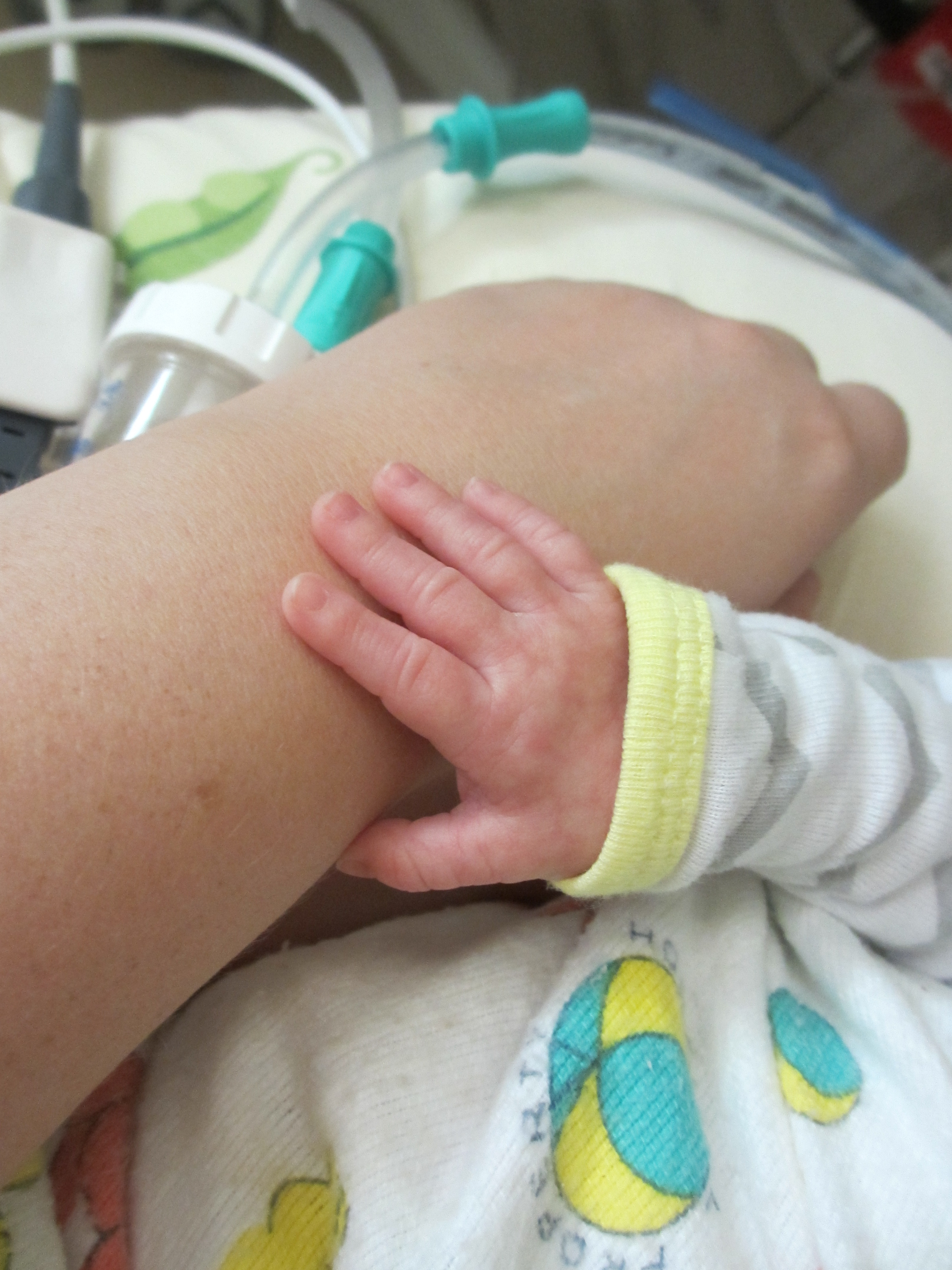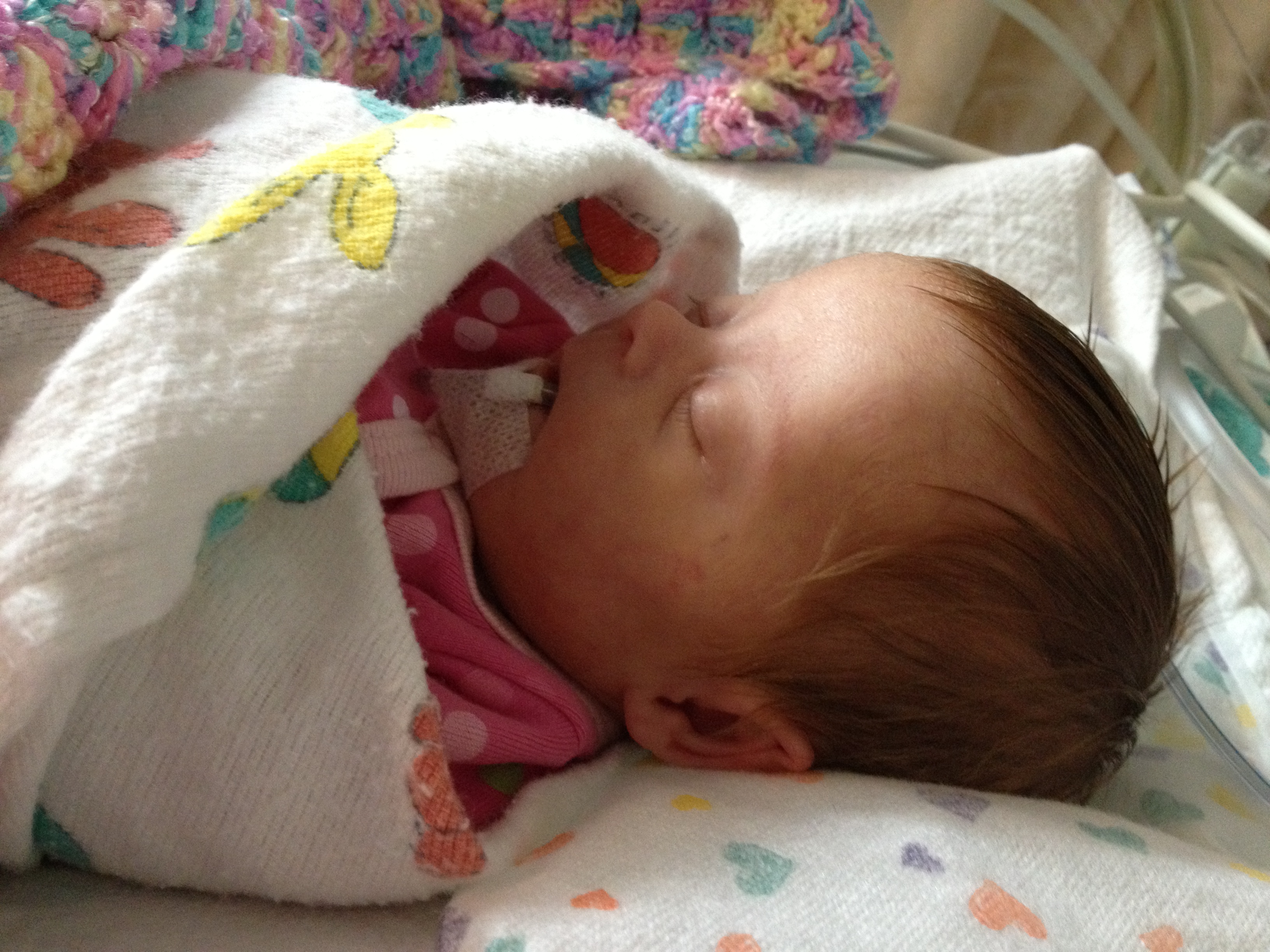 WHAT A DAY! Little bug lost 0.3 oz last night, but we’re hoping she’ll have gained some back tonight. I don’t know though – she had a rough day. Early on the day wasn’t so bad – she had a nice visit with friends Cathy and Gene, and was held (in full swaddle) by both mamas. But her afternoon was pretty hard. They’ve started putting gauze over her g-tube to cover it up while we do kangaroo time. I think today was the third day they did it, and the nurse used a particularly huge piece of gauze this time. Well, while I was holding Leah she was really squirmy and fussy even after she was fed, so we put her back down to see what was wrong. As it turned out, the big piece of gauze was stuck to the g-tube and had edged it out of her tummy about half an inch. No wonder she was squirmy! Resolving the issue was even more uncomfortable for her, especially since they had to take the tape off and reposition the tube. It broke our hearts to see her crying so hard. Thankfully once it was back in place she seemed to calm down a bit, and was thoroughly tuckered out after that ordeal. I’m sure she got a great nap after that.