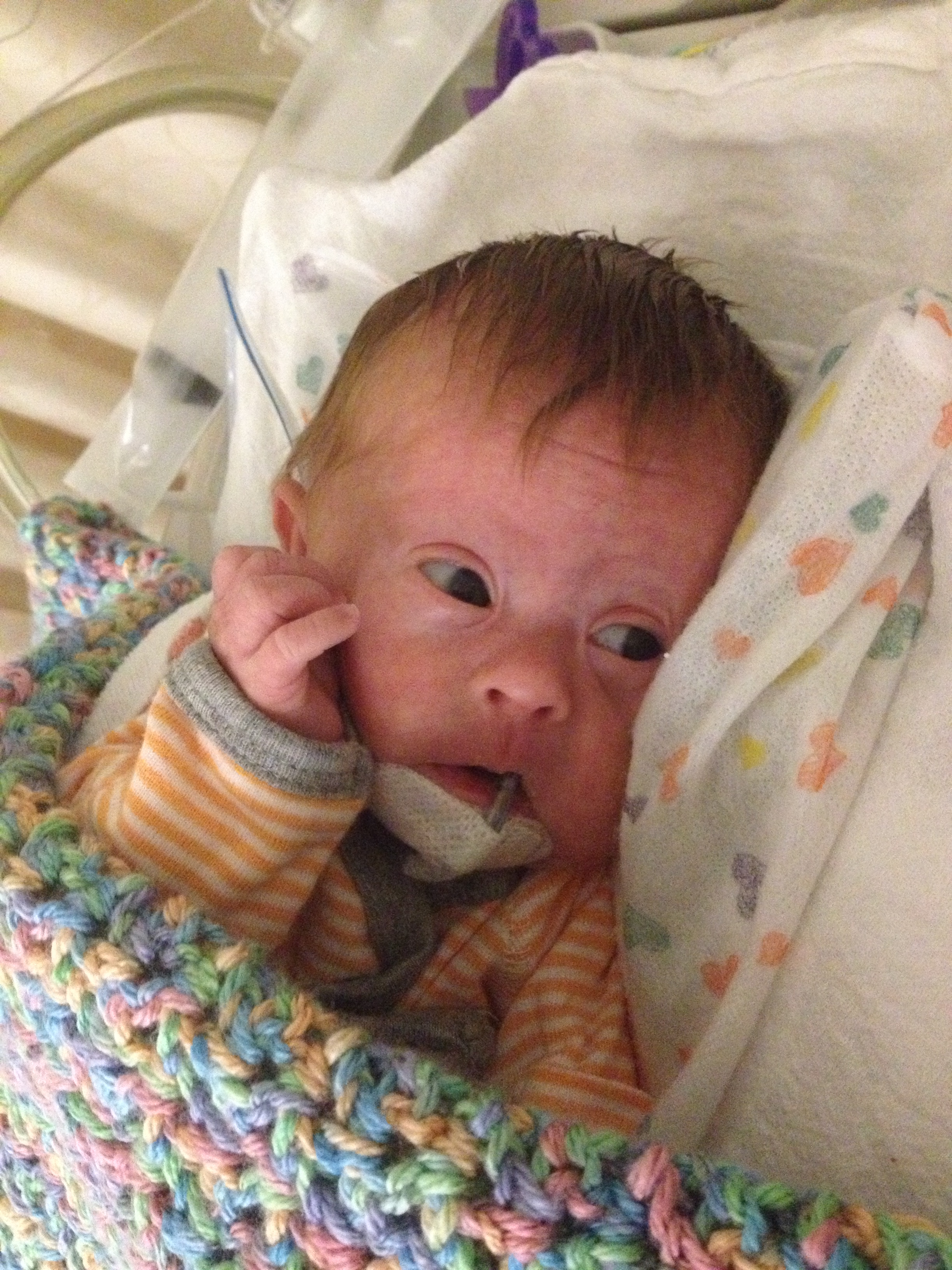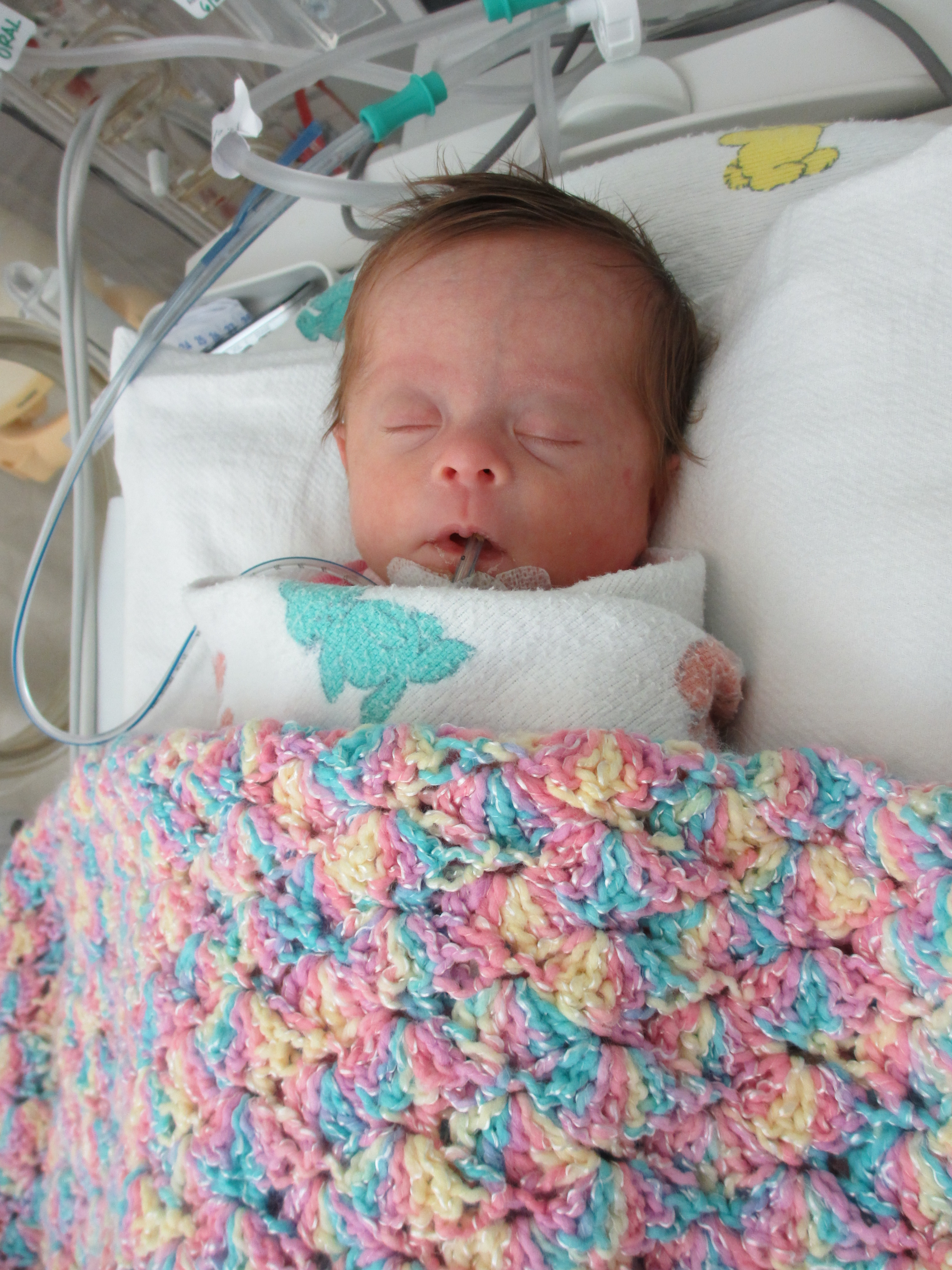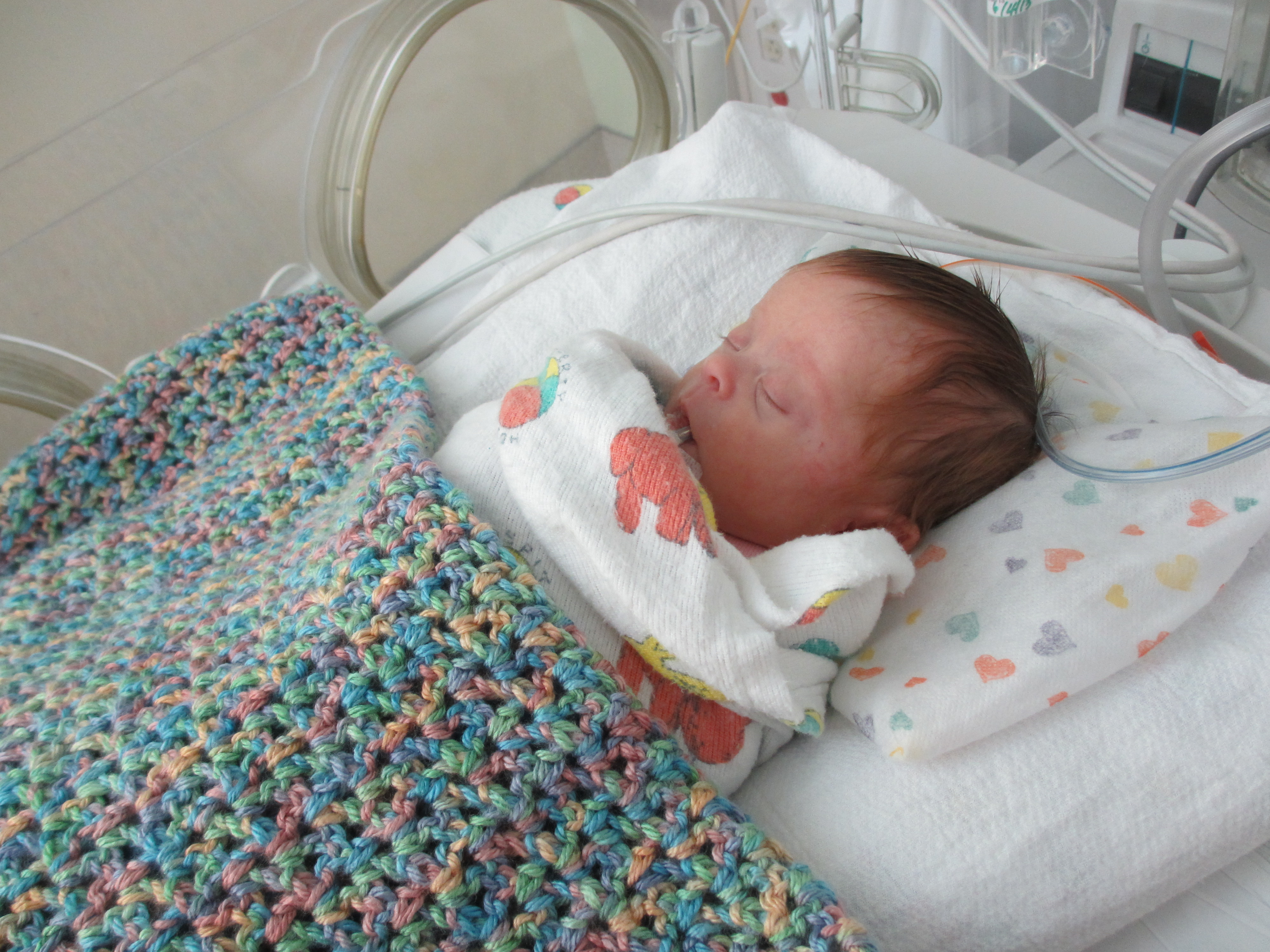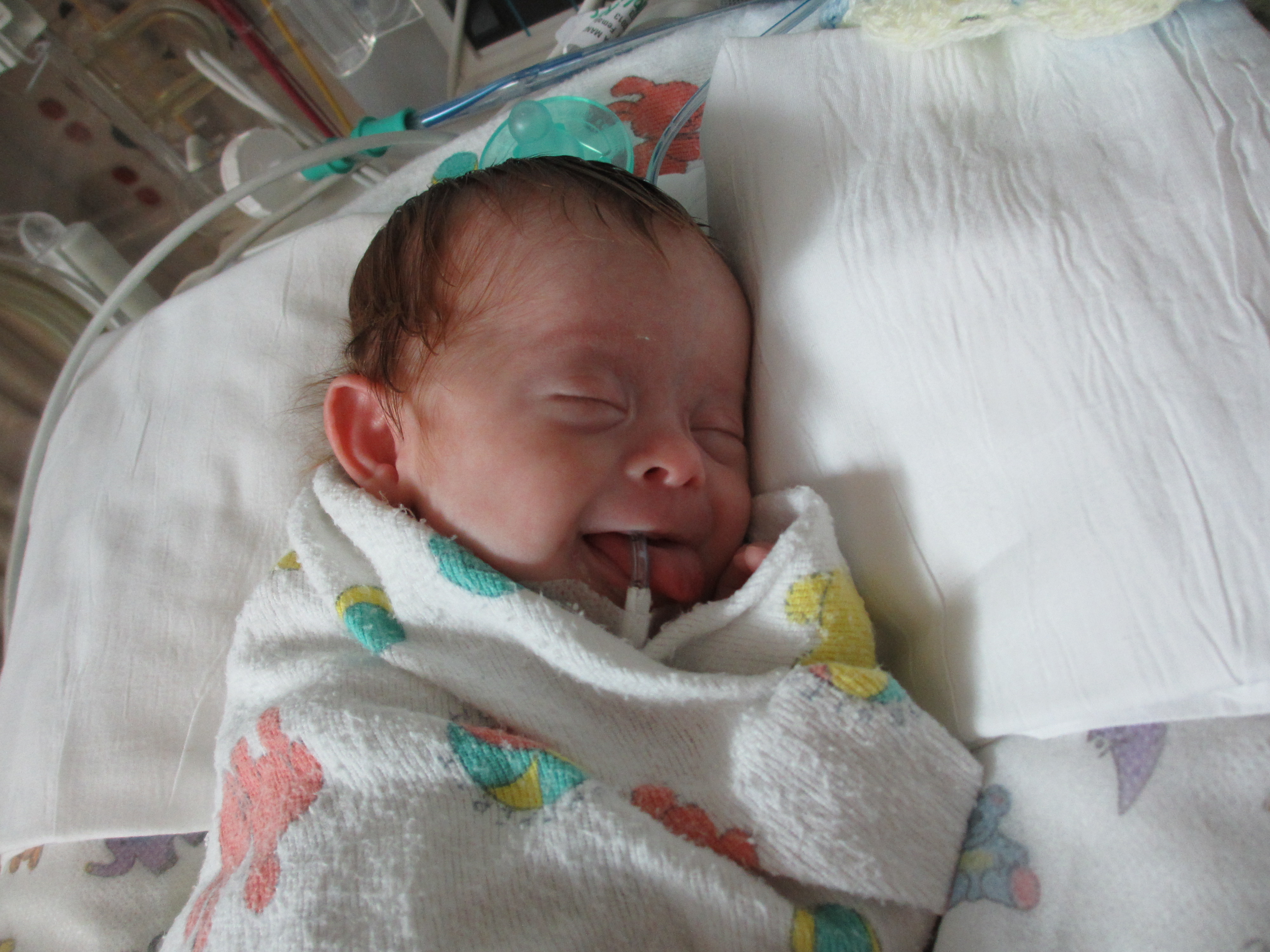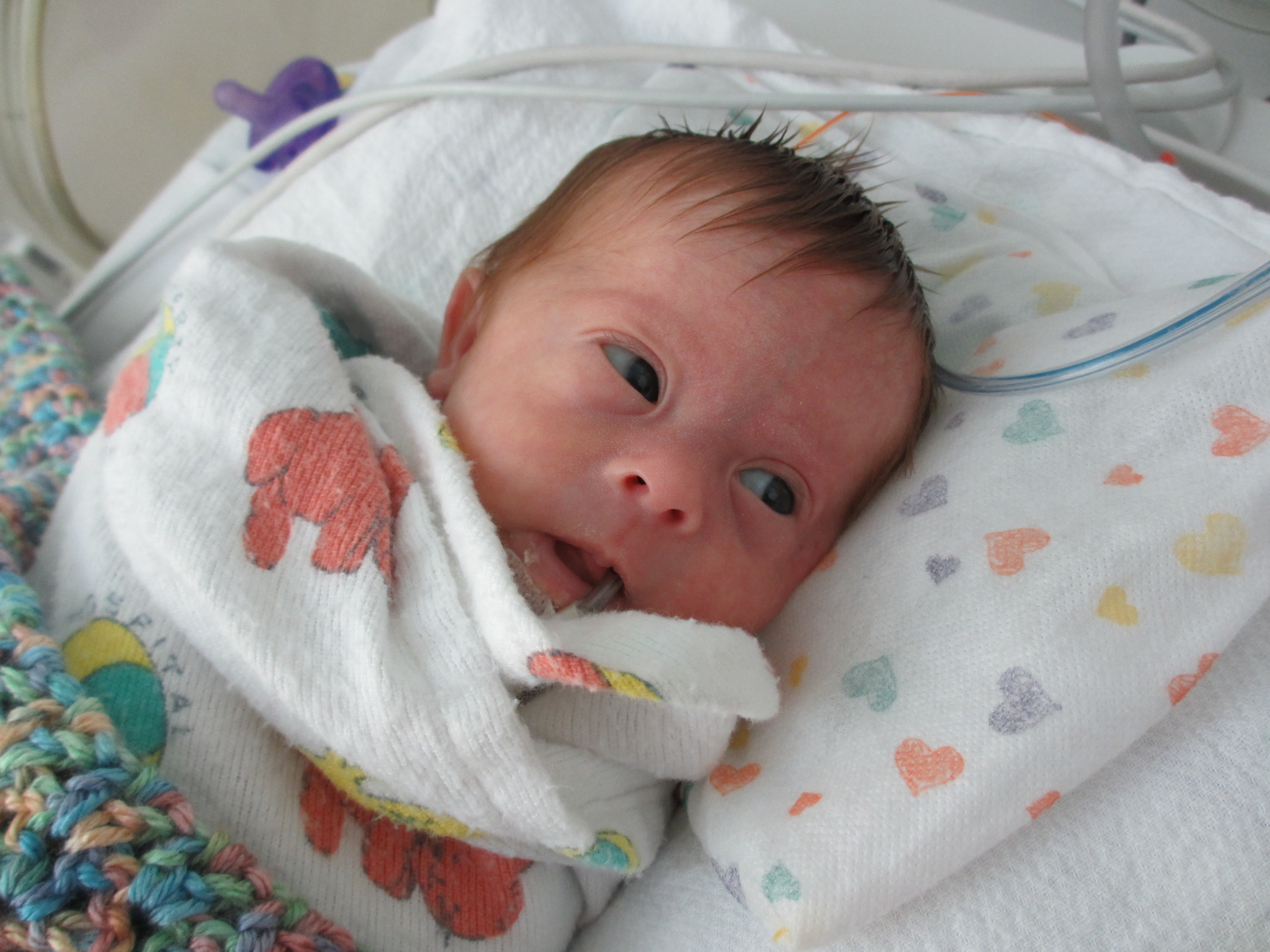 WHAT A DAY! Little bug lost 0.3 oz last night, but we’re hoping she’ll have gained some back tonight. I don’t know though – she had a rough day. Early on the day wasn’t so bad – she had a nice visit with friends Cathy and Gene, and was held (in full swaddle) by both mamas. But her afternoon was pretty hard. They’ve started putting gauze over her g-tube to cover it up while we do kangaroo time. I think today was the third day they did it, and the nurse used a particularly huge piece of gauze this time. Well, while I was holding Leah she was really squirmy and fussy even after she was fed, so we put her back down to see what was wrong. As it turned out, the big piece of gauze was stuck to the g-tube and had edged it out of her tummy about half an inch. No wonder she was squirmy! Resolving the issue was even more uncomfortable for her, especially since they had to take the tape off and reposition the tube. It broke our hearts to see her crying so hard. Thankfully once it was back in place she seemed to calm down a bit, and was thoroughly tuckered out after that ordeal. I’m sure she got a great nap after that.