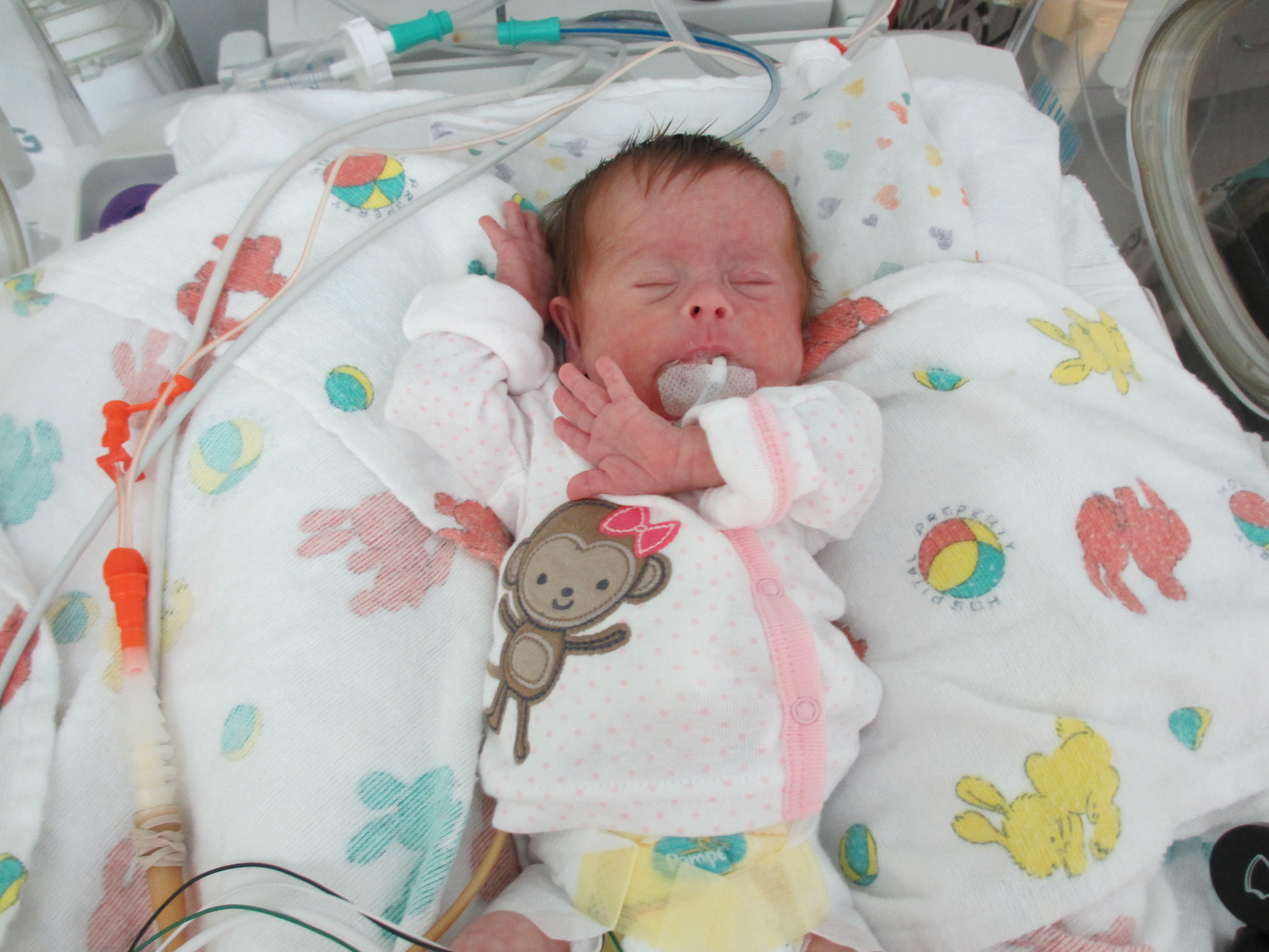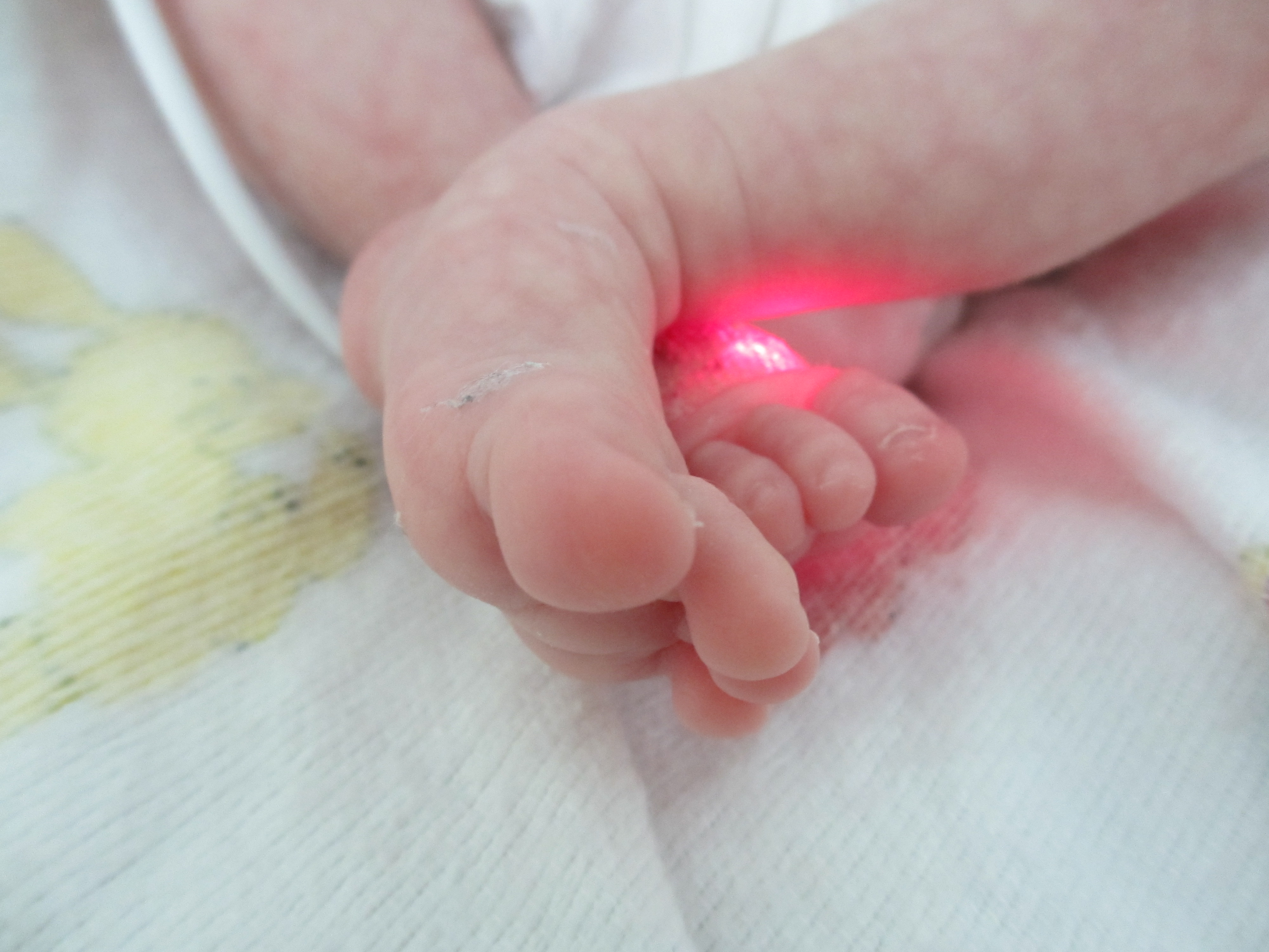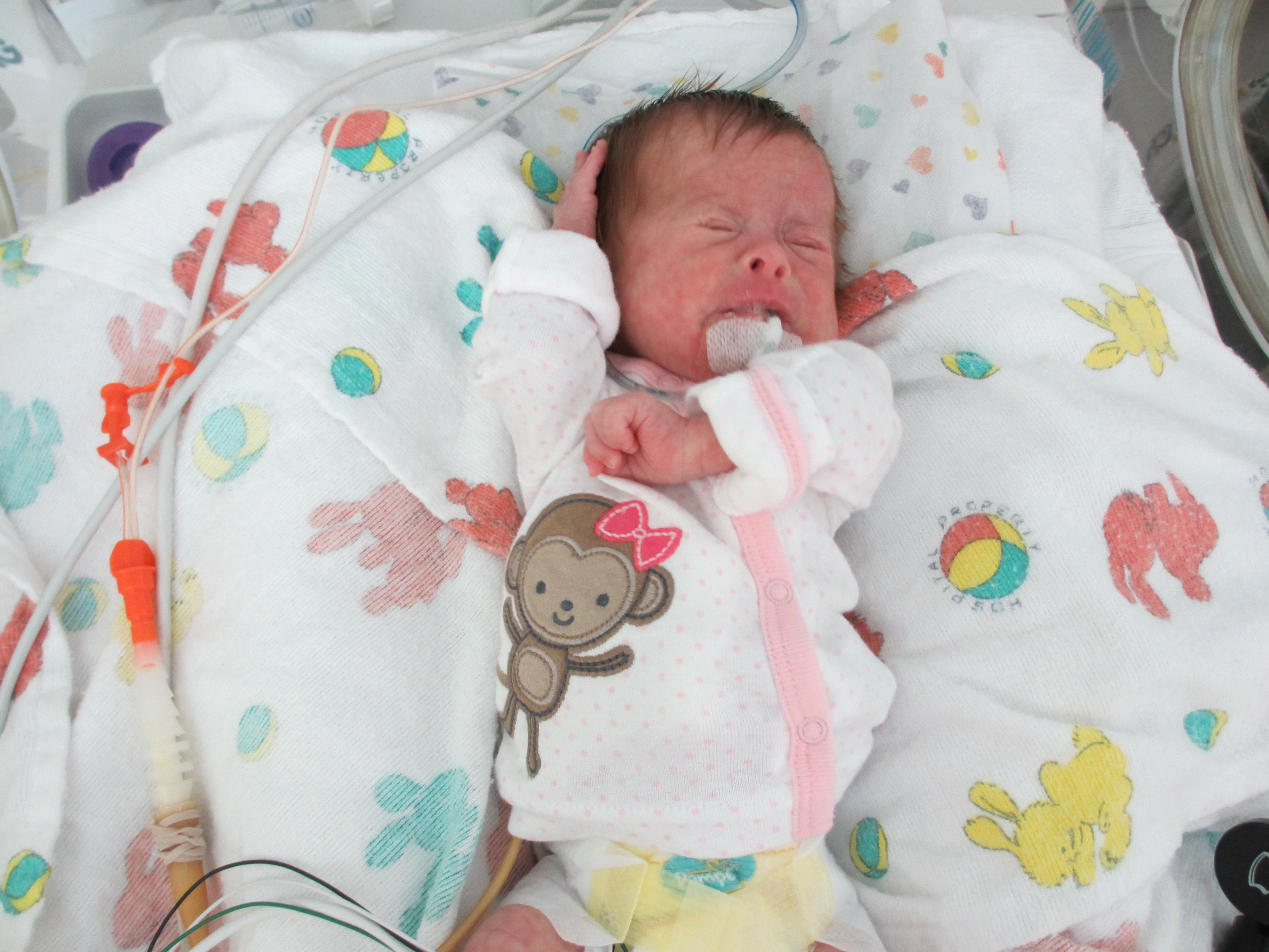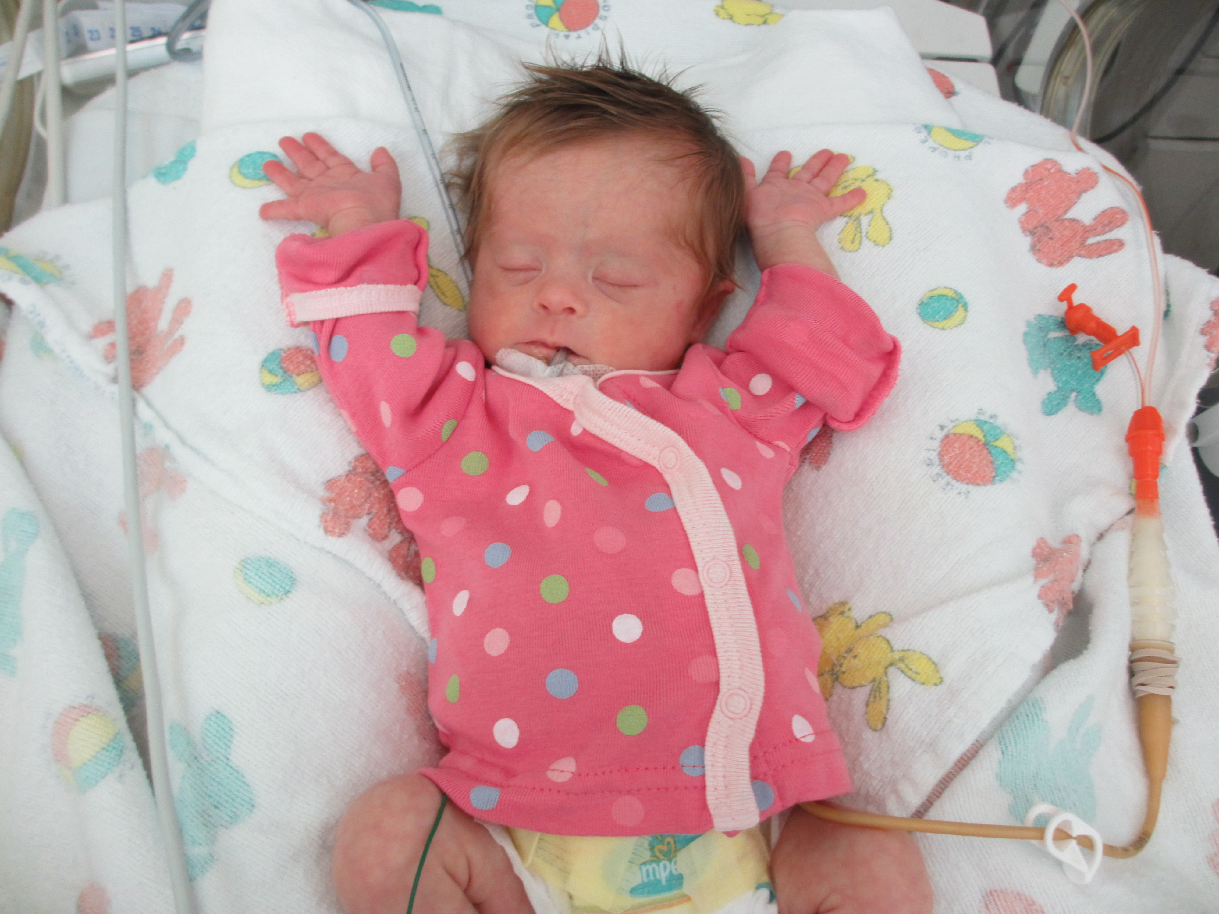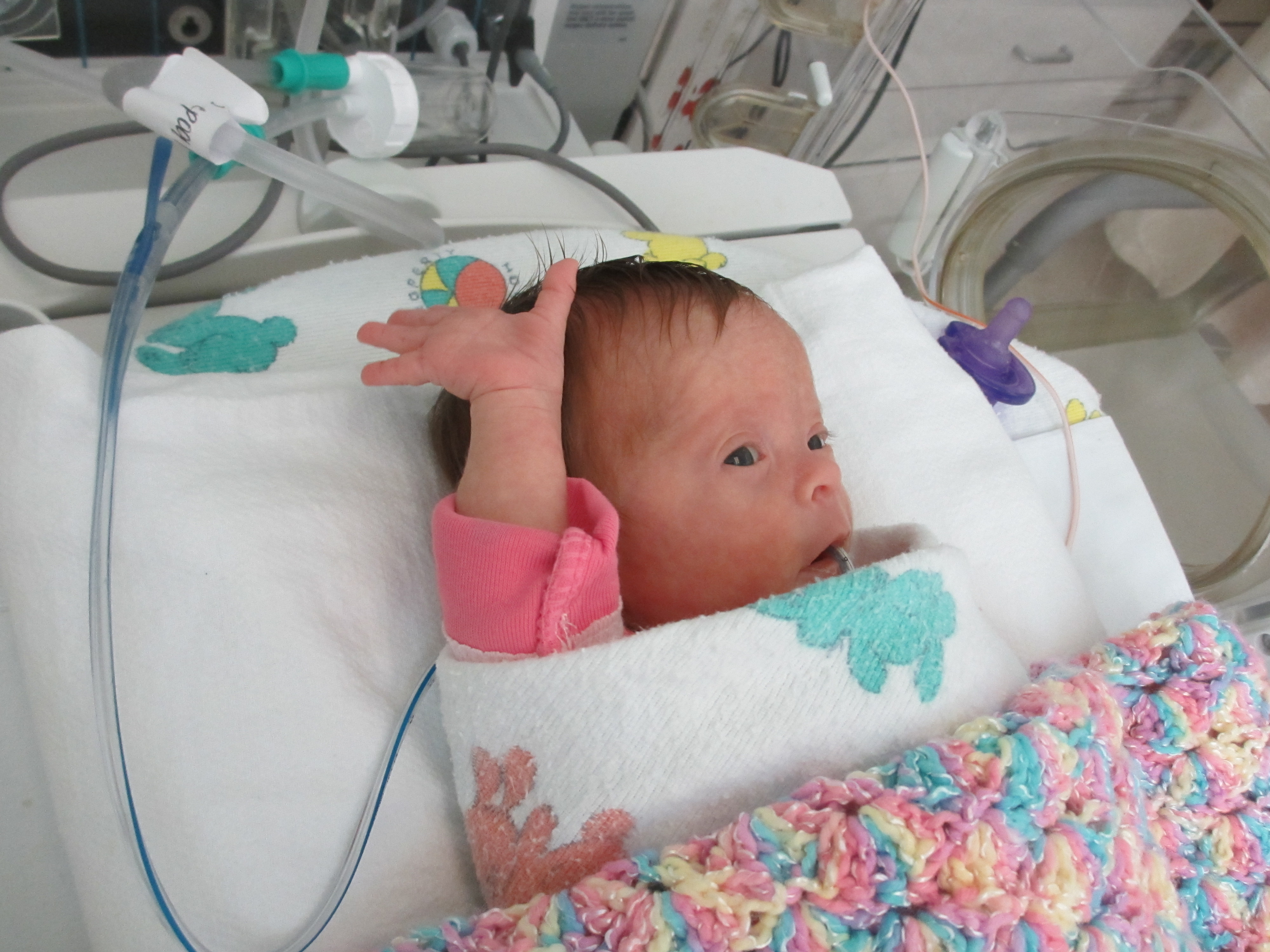 WHAT A DAY! Little bug lost 0.3 oz last night, but we’re hoping she’ll have gained some back tonight. I don’t know though – she had a rough day. Early on the day wasn’t so bad – she had a nice visit with friends Cathy and Gene, and was held (in full swaddle) by both mamas. But her afternoon was pretty hard. They’ve started putting gauze over her g-tube to cover it up while we do kangaroo time. I think today was the third day they did it, and the nurse used a particularly huge piece of gauze this time. Well, while I was holding Leah she was really squirmy and fussy even after she was fed, so we put her back down to see what was wrong. As it turned out, the big piece of gauze was stuck to the g-tube and had edged it out of her tummy about half an inch. No wonder she was squirmy! Resolving the issue was even more uncomfortable for her, especially since they had to take the tape off and reposition the tube. It broke our hearts to see her crying so hard. Thankfully once it was back in place she seemed to calm down a bit, and was thoroughly tuckered out after that ordeal. I’m sure she got a great nap after that.