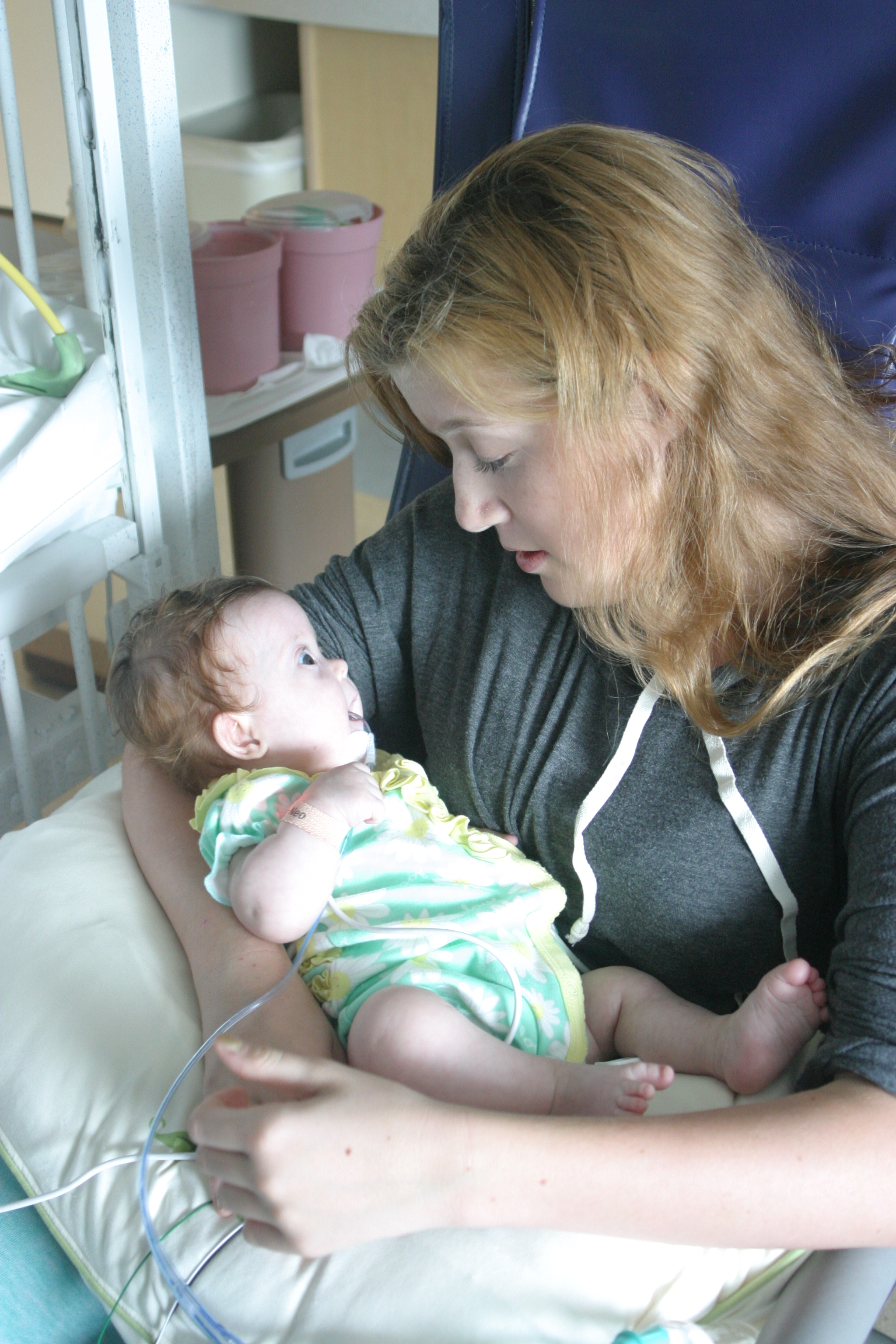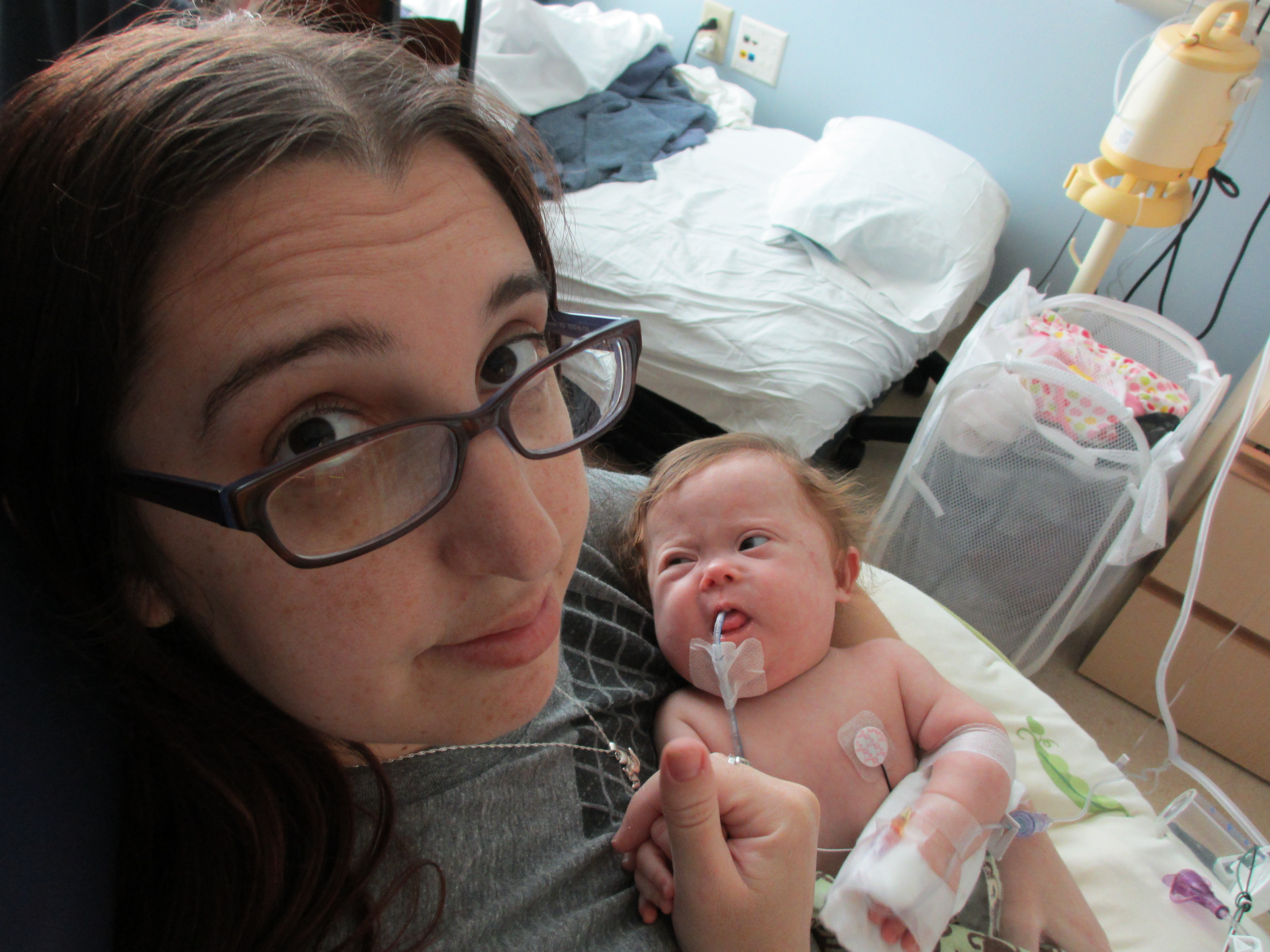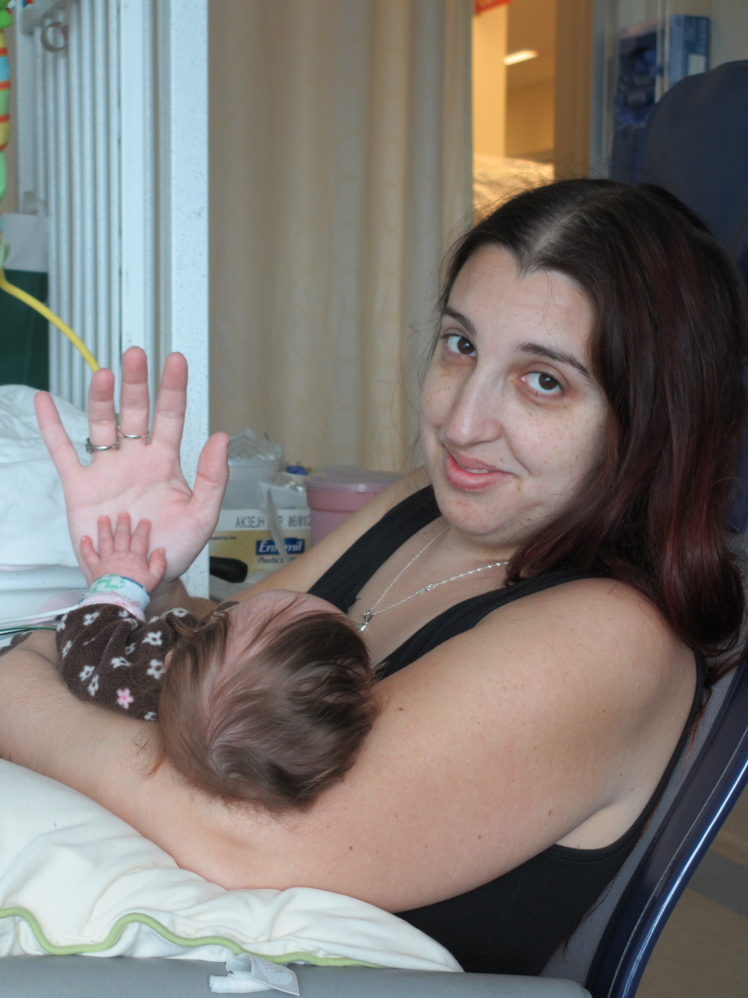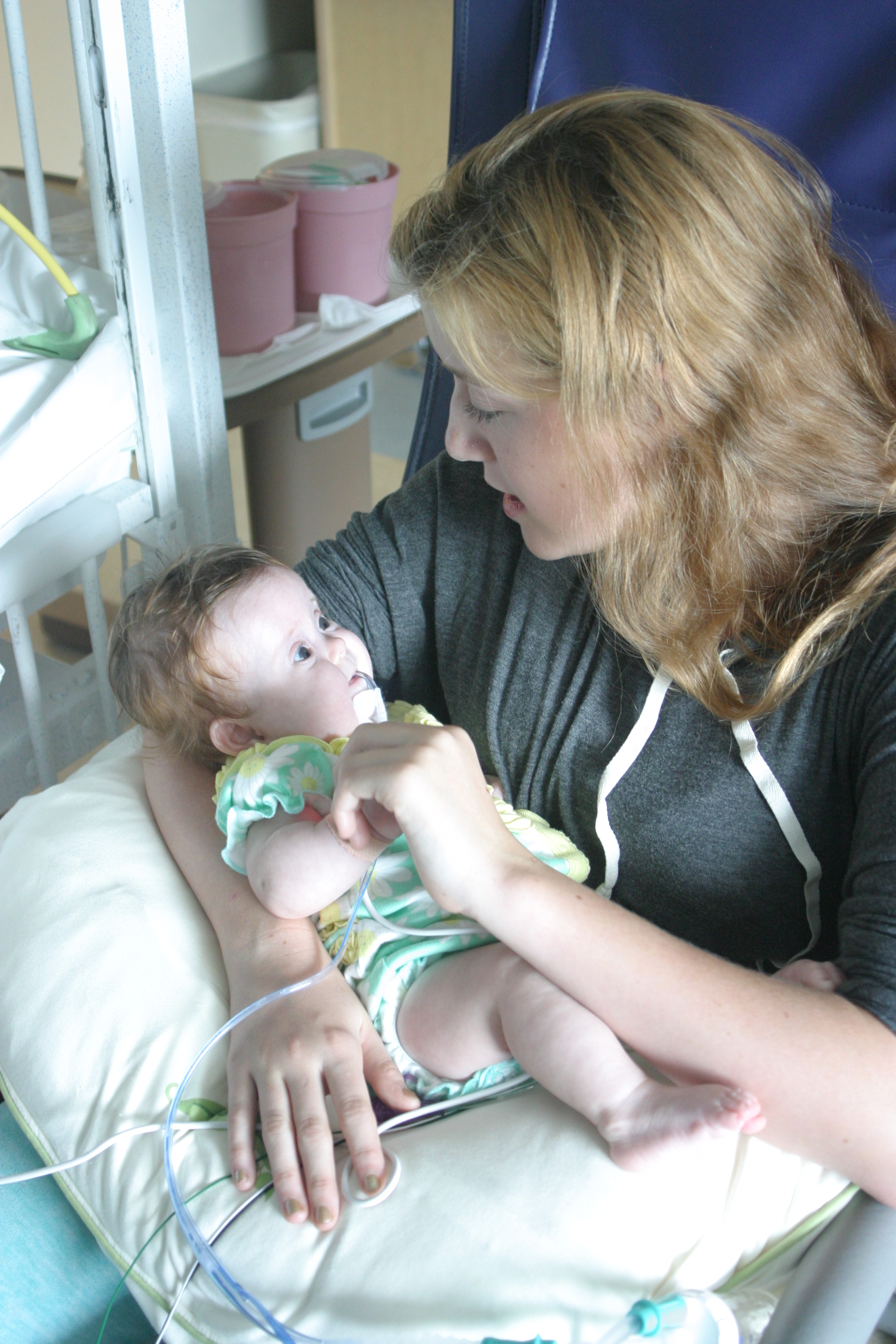 Now for a random musing: It’s funny how nurses sometimes try to rationalize a situation without fully assessing it – kind of like the other day when they assumed BabyBug’s horrible raspy breaths were actually the sounds of the suction tube sucking when in fact they suggested the opposite. Tonight I let the night nurse know that Leah’s suction pump was vacillating between off and barely-on-but-not-really (it’s on low intermittent but this was pretty ridiculously low). She said it was supposed to be like that because it was on low intermittent suction, and headed back out. I watched the meter for a minute to see if it would change, and then went out and got her again and said I thought maybe someone had turned it down because the meter was not really moving and neither were the secretions in the tube (it’s happened a few times that a nurse would put it on continuous suction to flush the tube and then forget to switch it back to intermittent, so someone turning it down was certainly a possibility). She looked and repeated that it was supposed to be like that. I said no, usually the meter is a lot higher. She said she didn’t want to put it any higher because it would suction too much. I said it wasn’t moving at all.