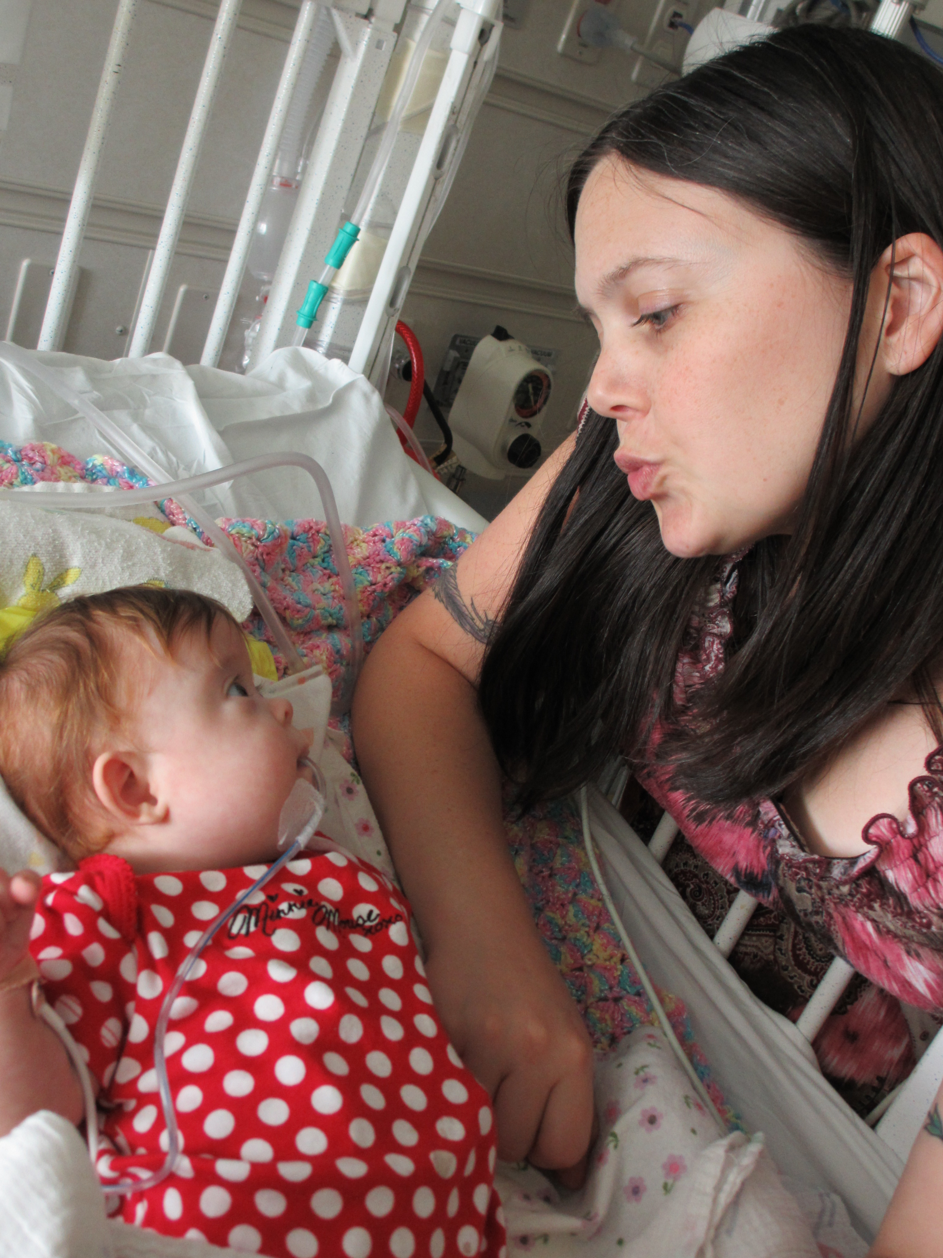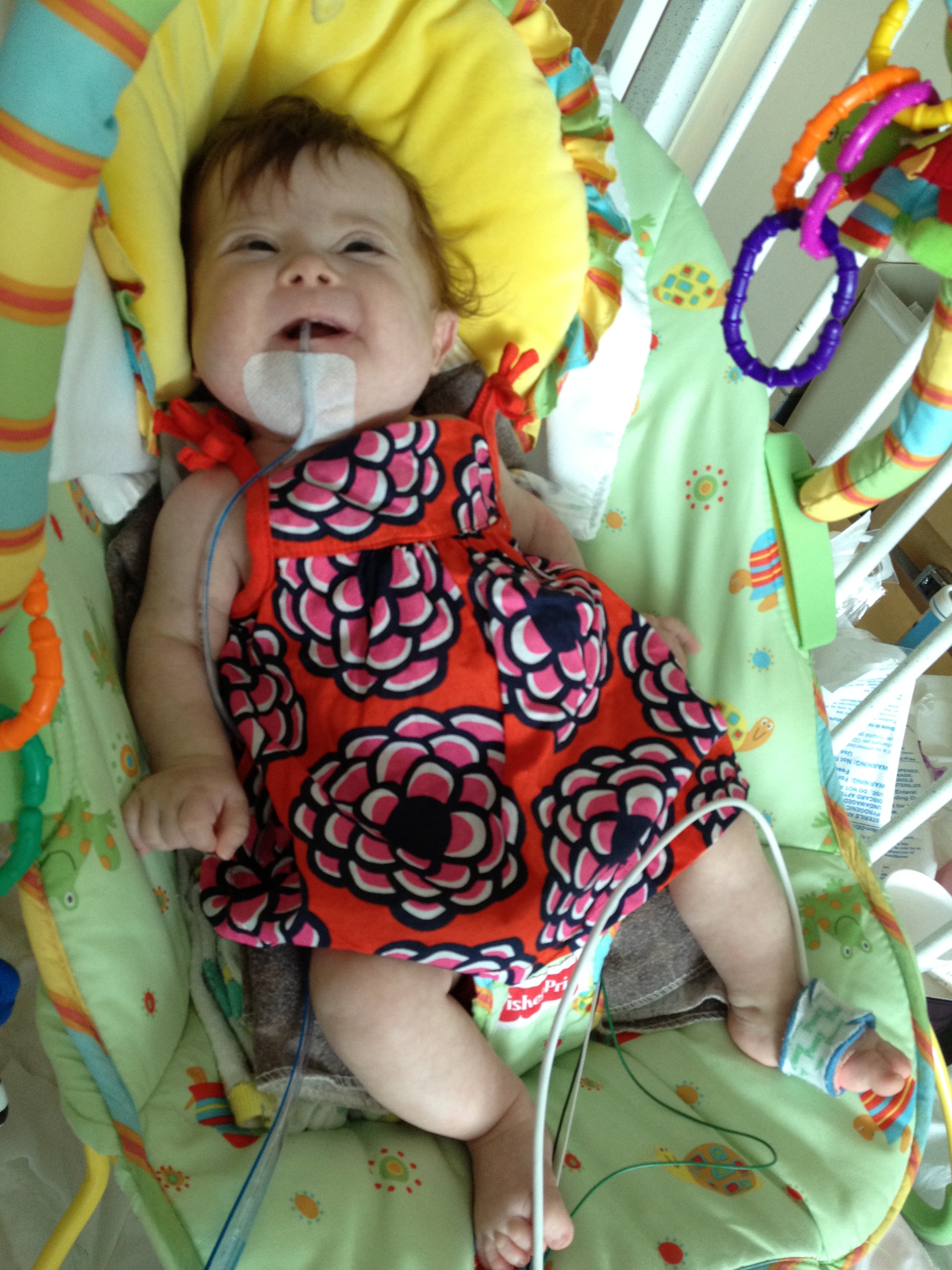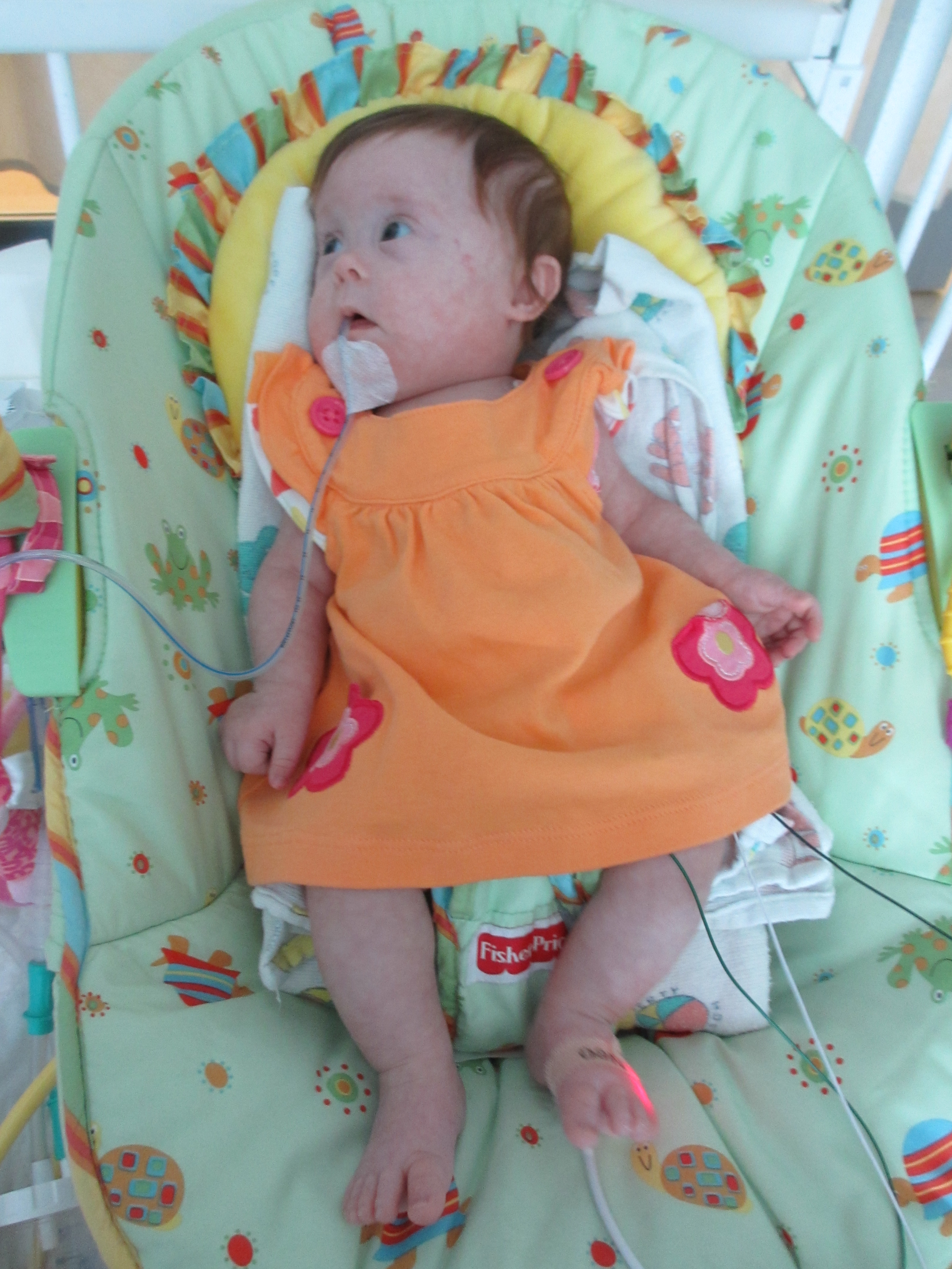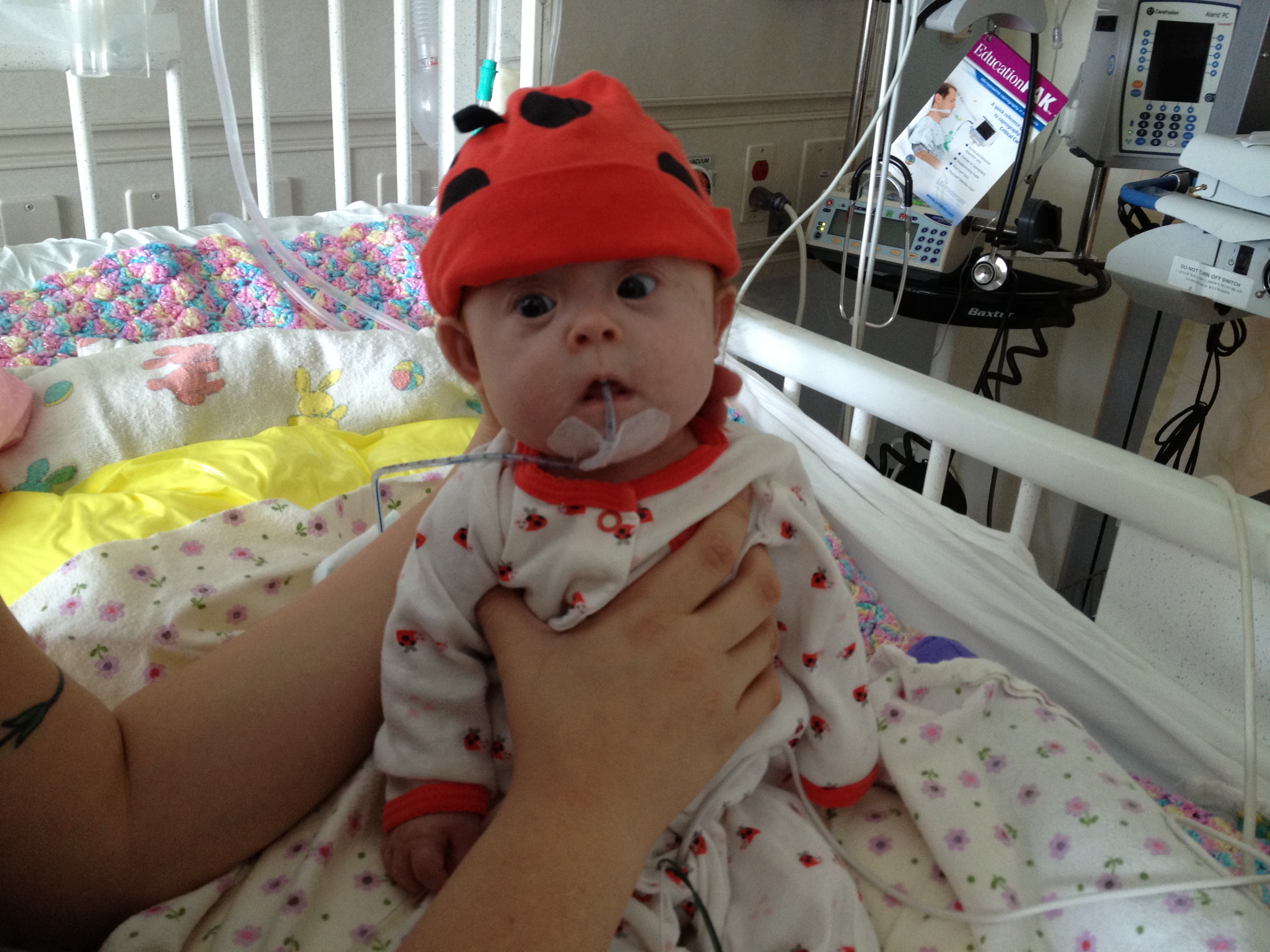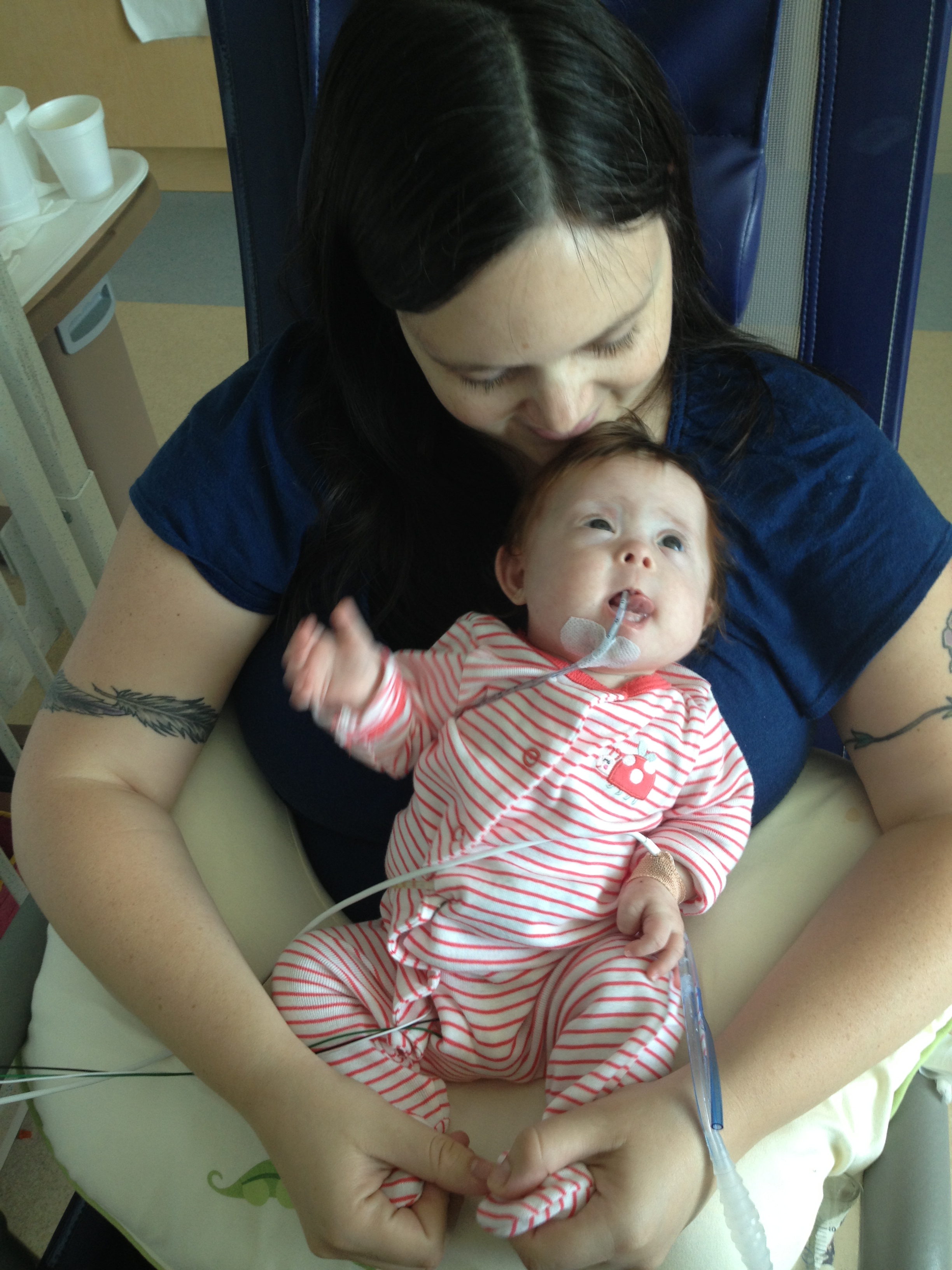 Now for a random musing: It’s funny how nurses sometimes try to rationalize a situation without fully assessing it – kind of like the other day when they assumed BabyBug’s horrible raspy breaths were actually the sounds of the suction tube sucking when in fact they suggested the opposite. Tonight I let the night nurse know that Leah’s suction pump was vacillating between off and barely-on-but-not-really (it’s on low intermittent but this was pretty ridiculously low). She said it was supposed to be like that because it was on low intermittent suction, and headed back out. I watched the meter for a minute to see if it would change, and then went out and got her again and said I thought maybe someone had turned it down because the meter was not really moving and neither were the secretions in the tube (it’s happened a few times that a nurse would put it on continuous suction to flush the tube and then forget to switch it back to intermittent, so someone turning it down was certainly a possibility). She looked and repeated that it was supposed to be like that. I said no, usually the meter is a lot higher. She said she didn’t want to put it any higher because it would suction too much. I said it wasn’t moving at all.