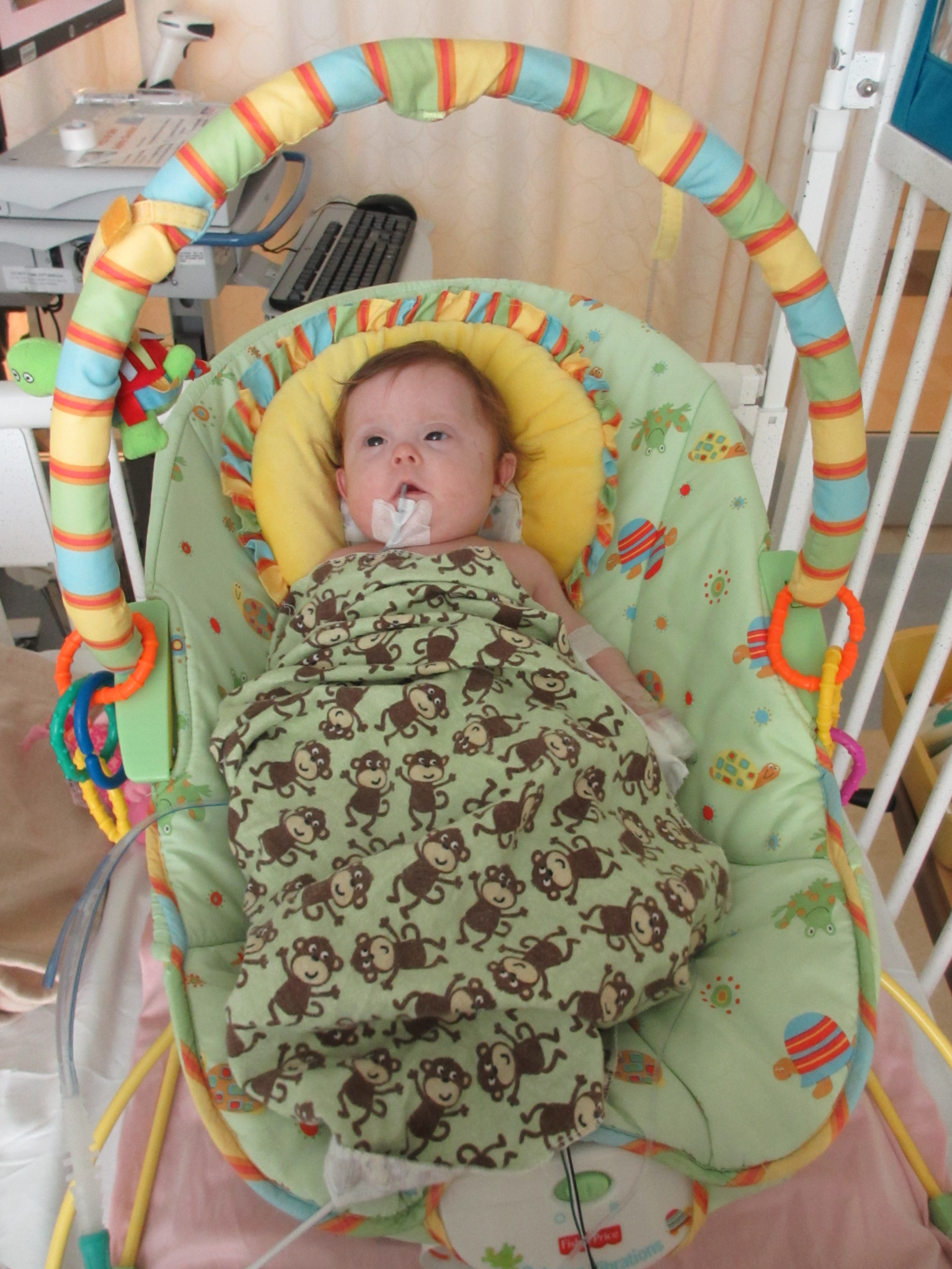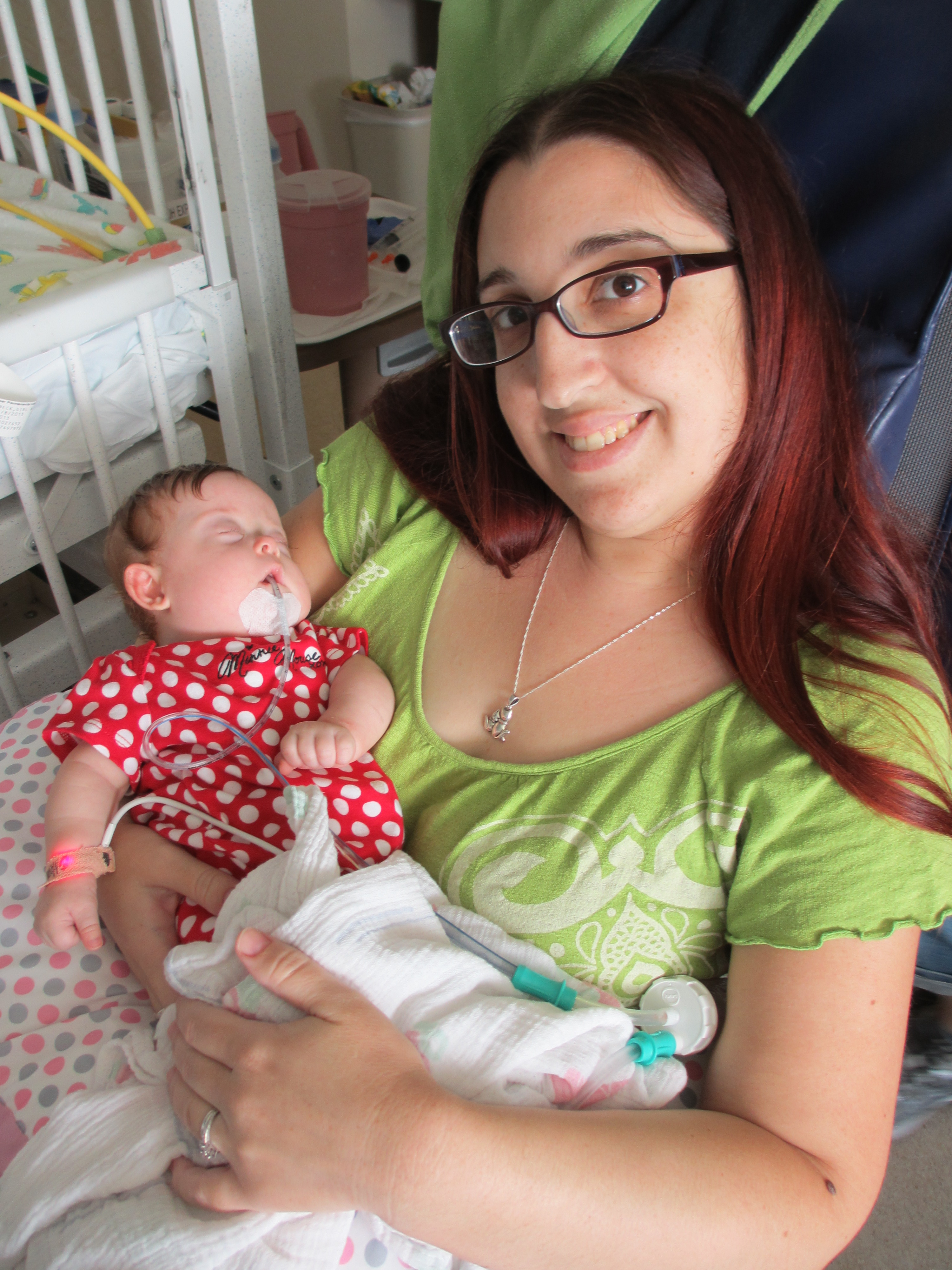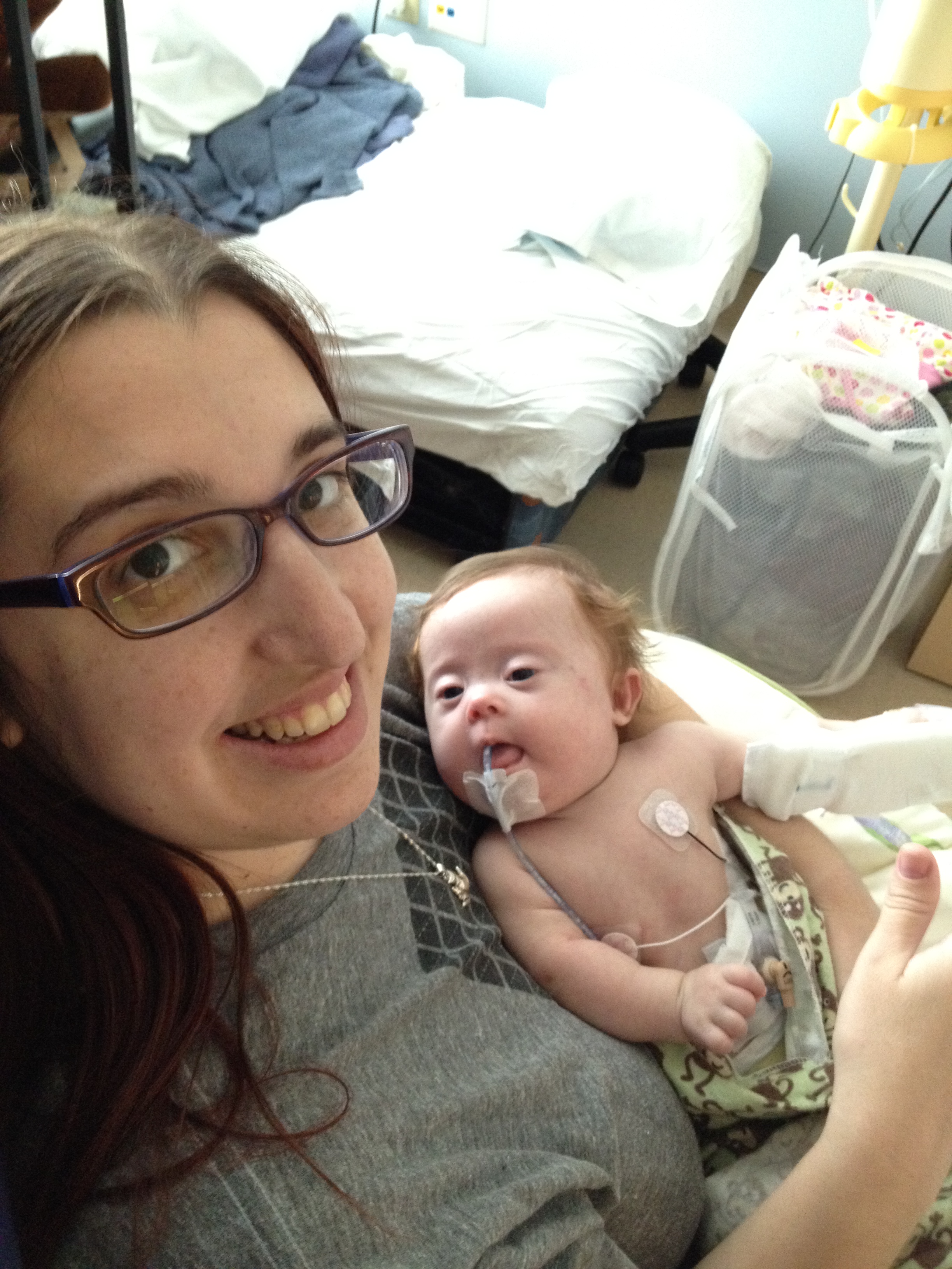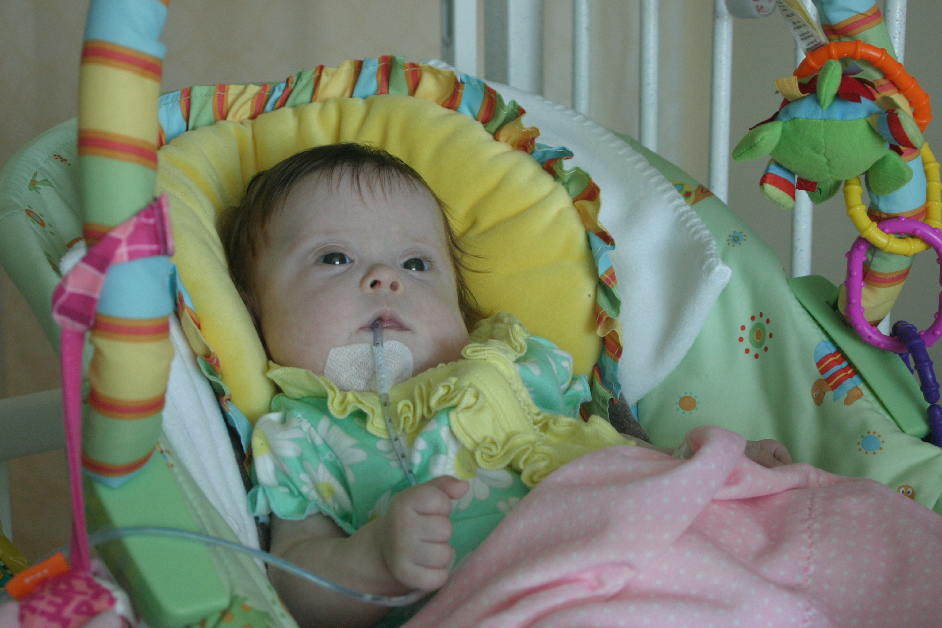 Now for a random musing: It’s funny how nurses sometimes try to rationalize a situation without fully assessing it – kind of like the other day when they assumed BabyBug’s horrible raspy breaths were actually the sounds of the suction tube sucking when in fact they suggested the opposite. Tonight I let the night nurse know that Leah’s suction pump was vacillating between off and barely-on-but-not-really (it’s on low intermittent but this was pretty ridiculously low). She said it was supposed to be like that because it was on low intermittent suction, and headed back out. I watched the meter for a minute to see if it would change, and then went out and got her again and said I thought maybe someone had turned it down because the meter was not really moving and neither were the secretions in the tube (it’s happened a few times that a nurse would put it on continuous suction to flush the tube and then forget to switch it back to intermittent, so someone turning it down was certainly a possibility). She looked and repeated that it was supposed to be like that. I said no, usually the meter is a lot higher. She said she didn’t want to put it any higher because it would suction too much. I said it wasn’t moving at all.