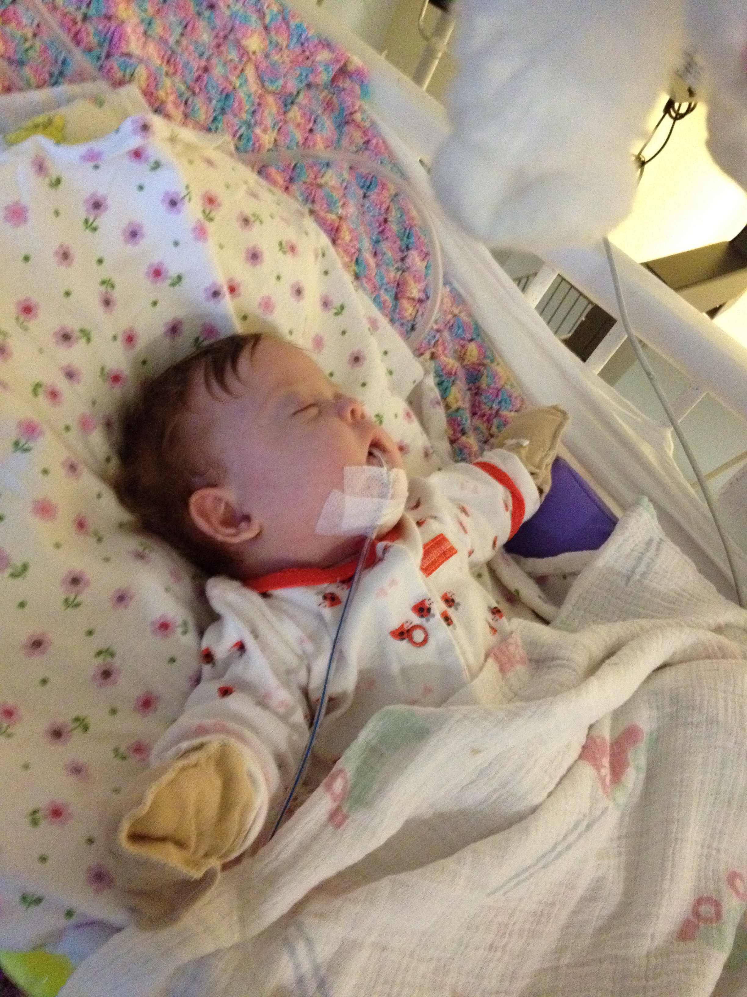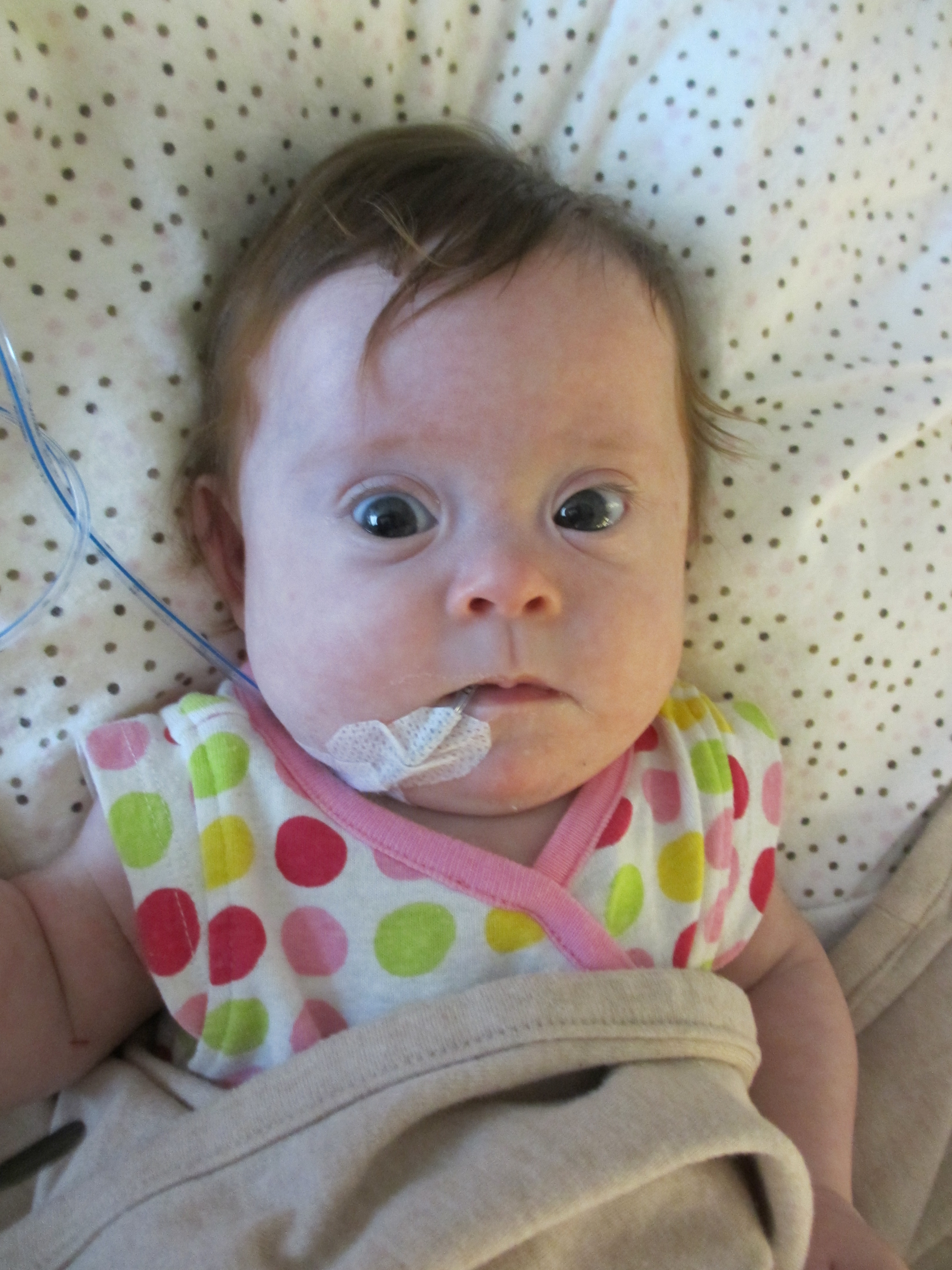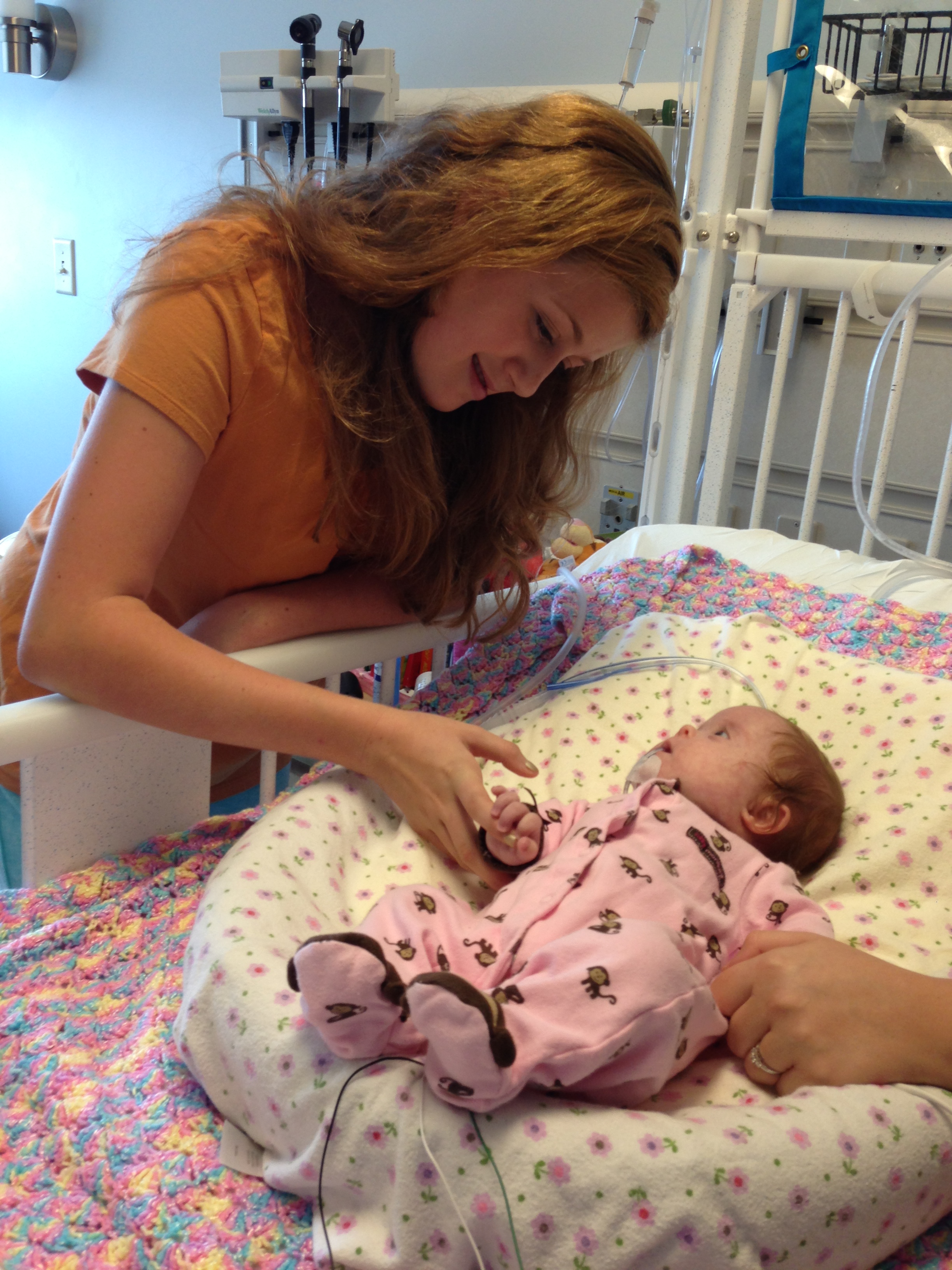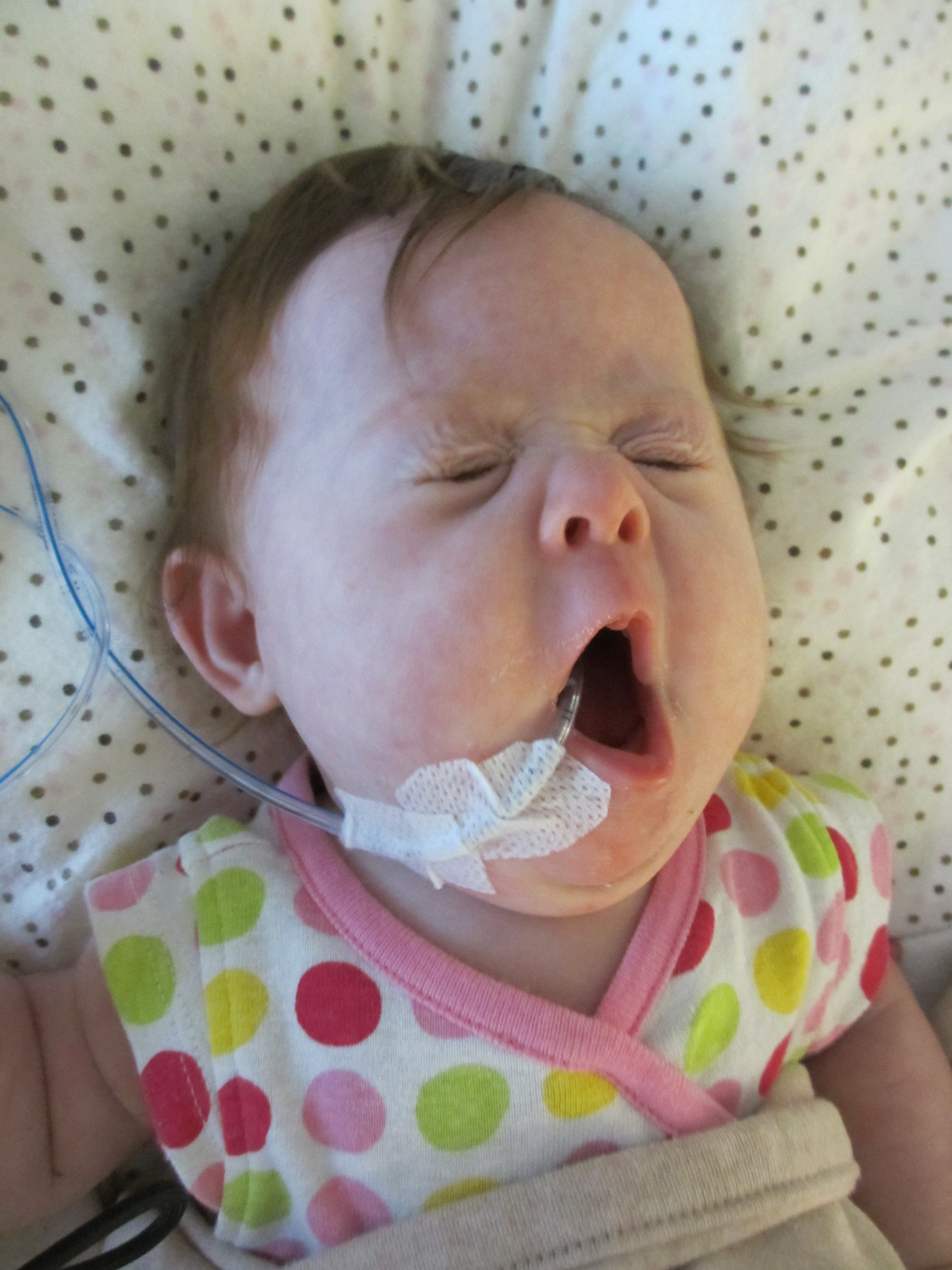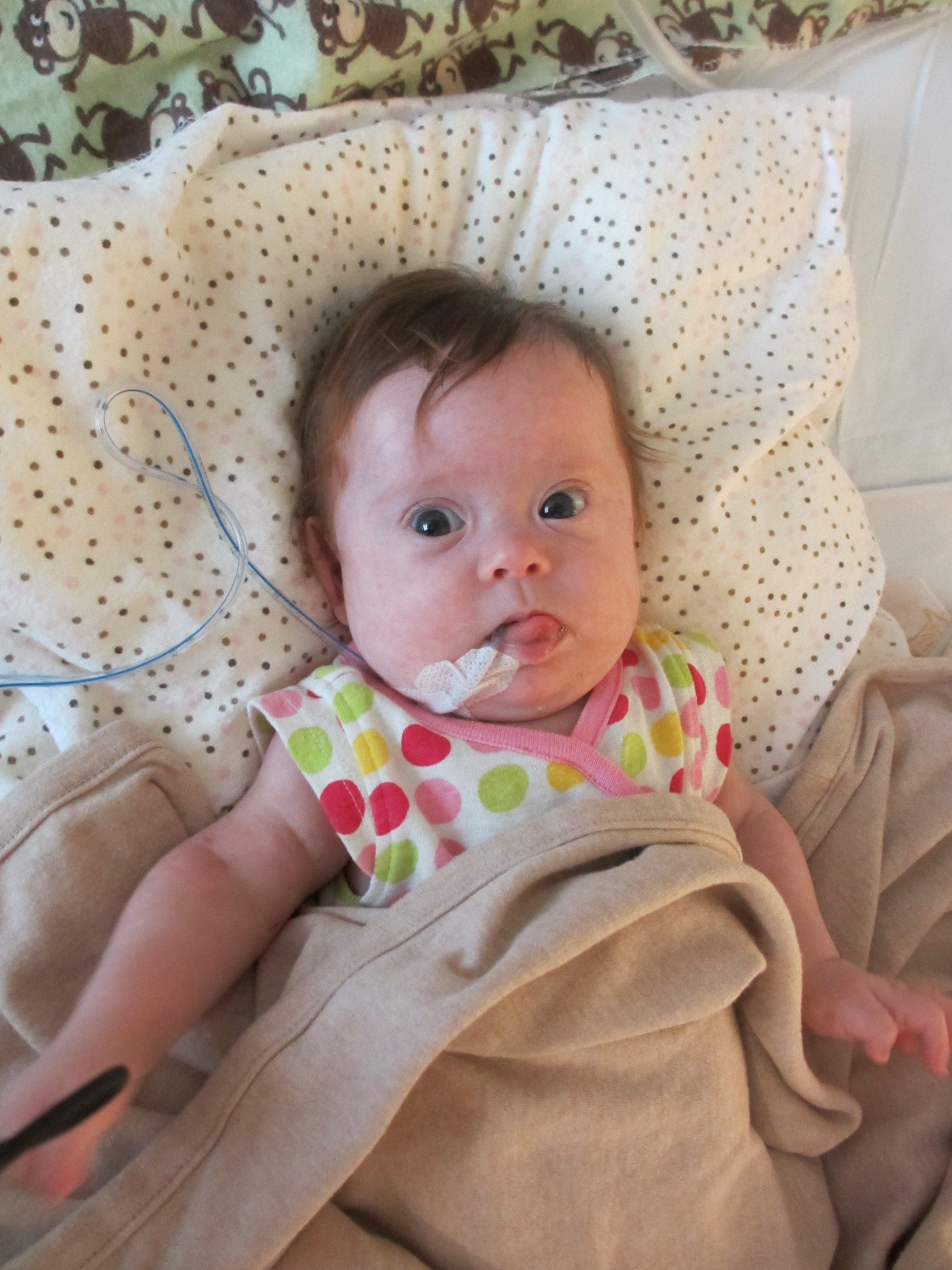 We asked earlier today if we might be able to take Leah outside for a couple of minutes just so she could experience fresh air and sunshine. The docs said no. We did get her nurses to agree to let us bring her to the pull-out couch a few feet from the crib so we could give her real tummy-time and give her some new surroundings for a little while. Mandy sat next to Leah on the pullout bed and put her on her tummy. Leah struggled for a minute and then pushed herself up – and then rolled over. Now, to be fair, Mandy was sitting on the bed so there was a slight incline in the direction that Leah rolled. But she pulled herself up onto her arms and she tipped herself over. That’s gotta be some sort of cool milestone, right? First accidental milestone? We tried to get her to do it again on video, but she had worn herself out and spent most of the remainder of her tummy time trying to eat the sheet we had laid out under her.