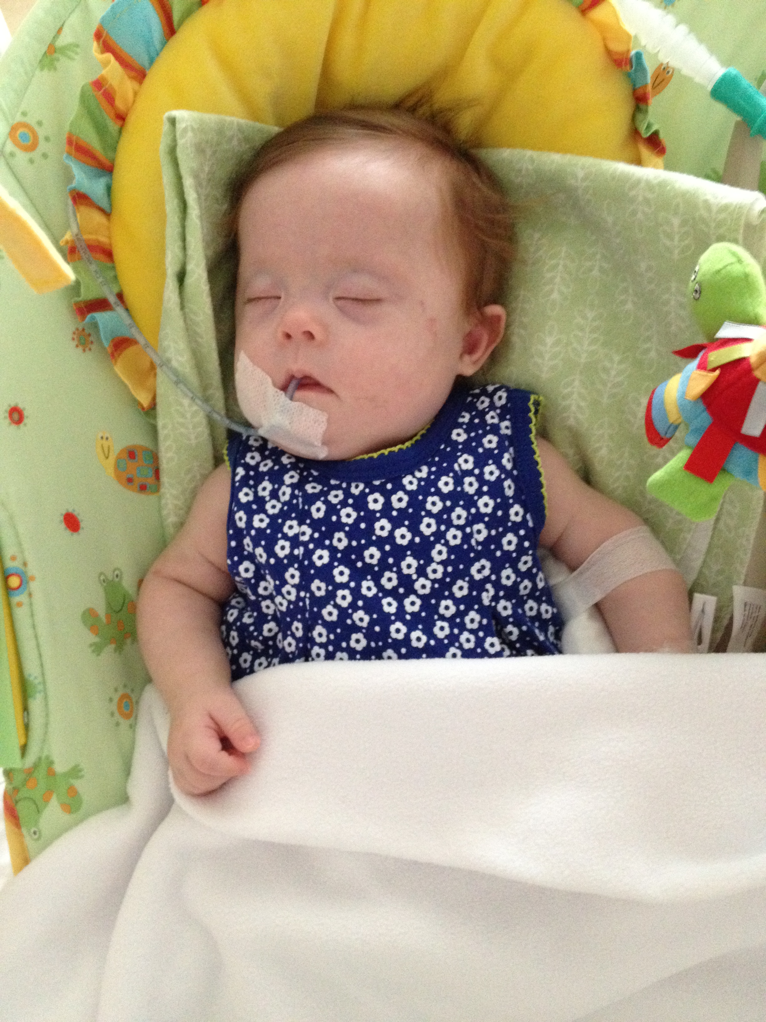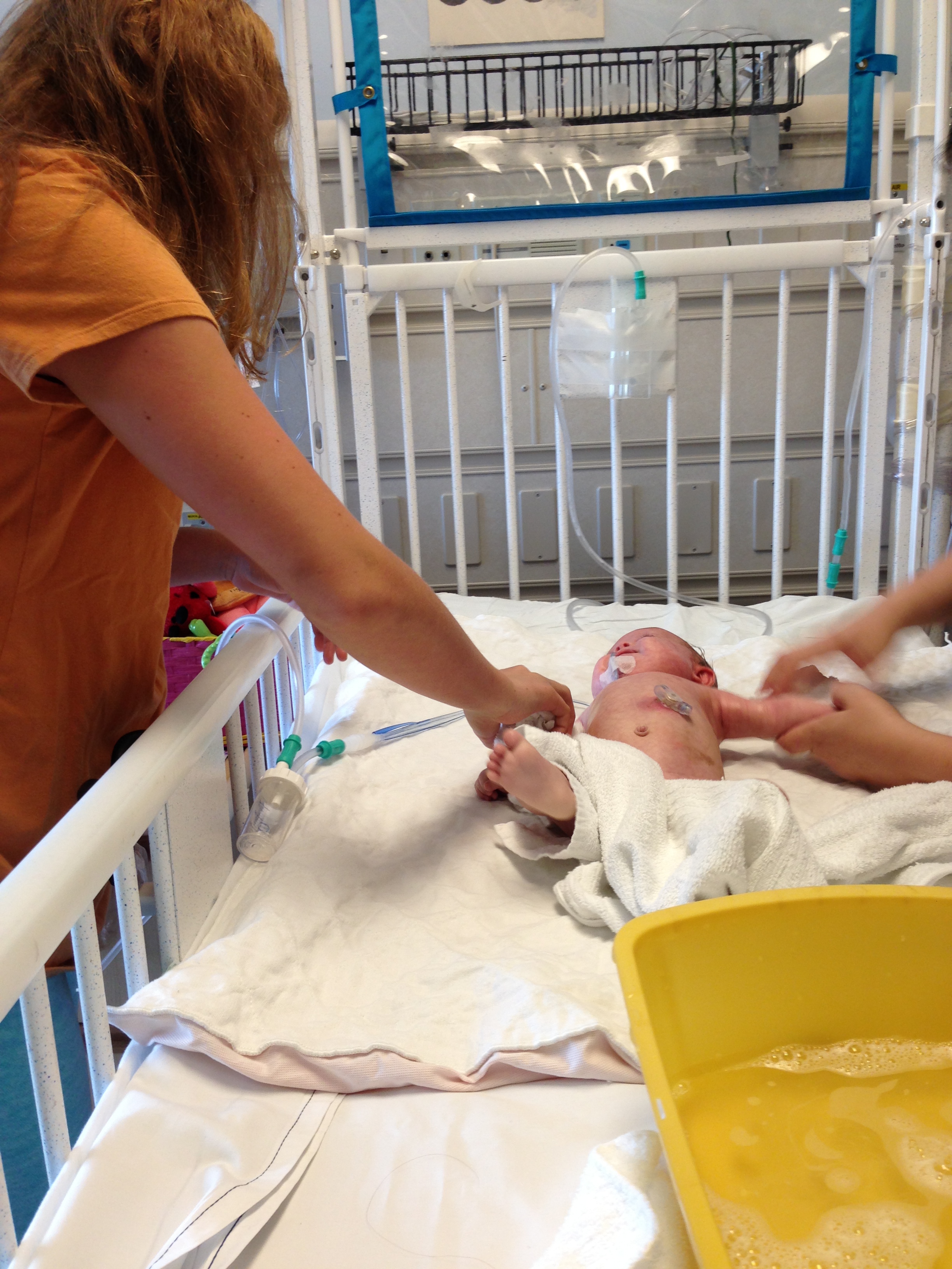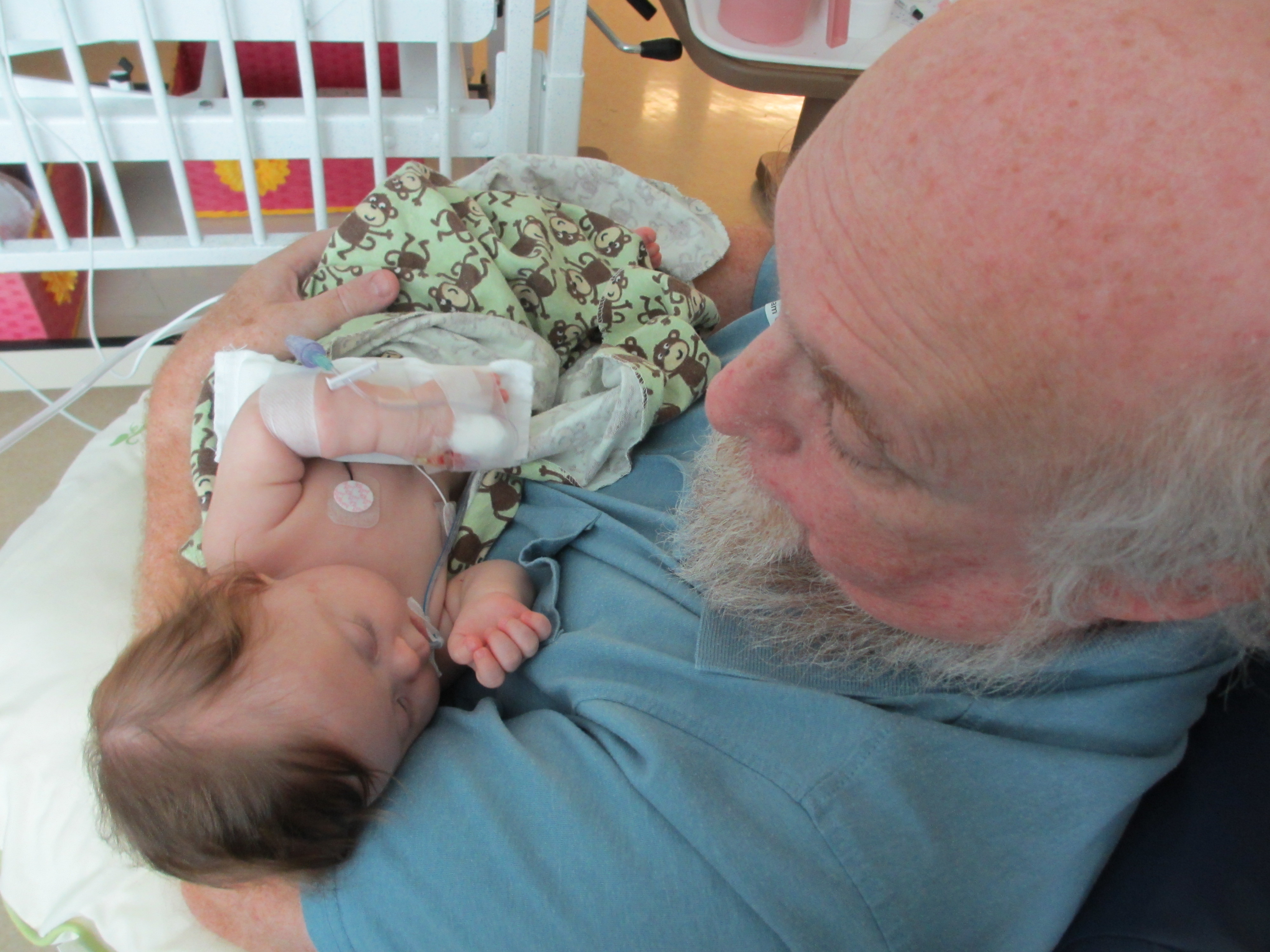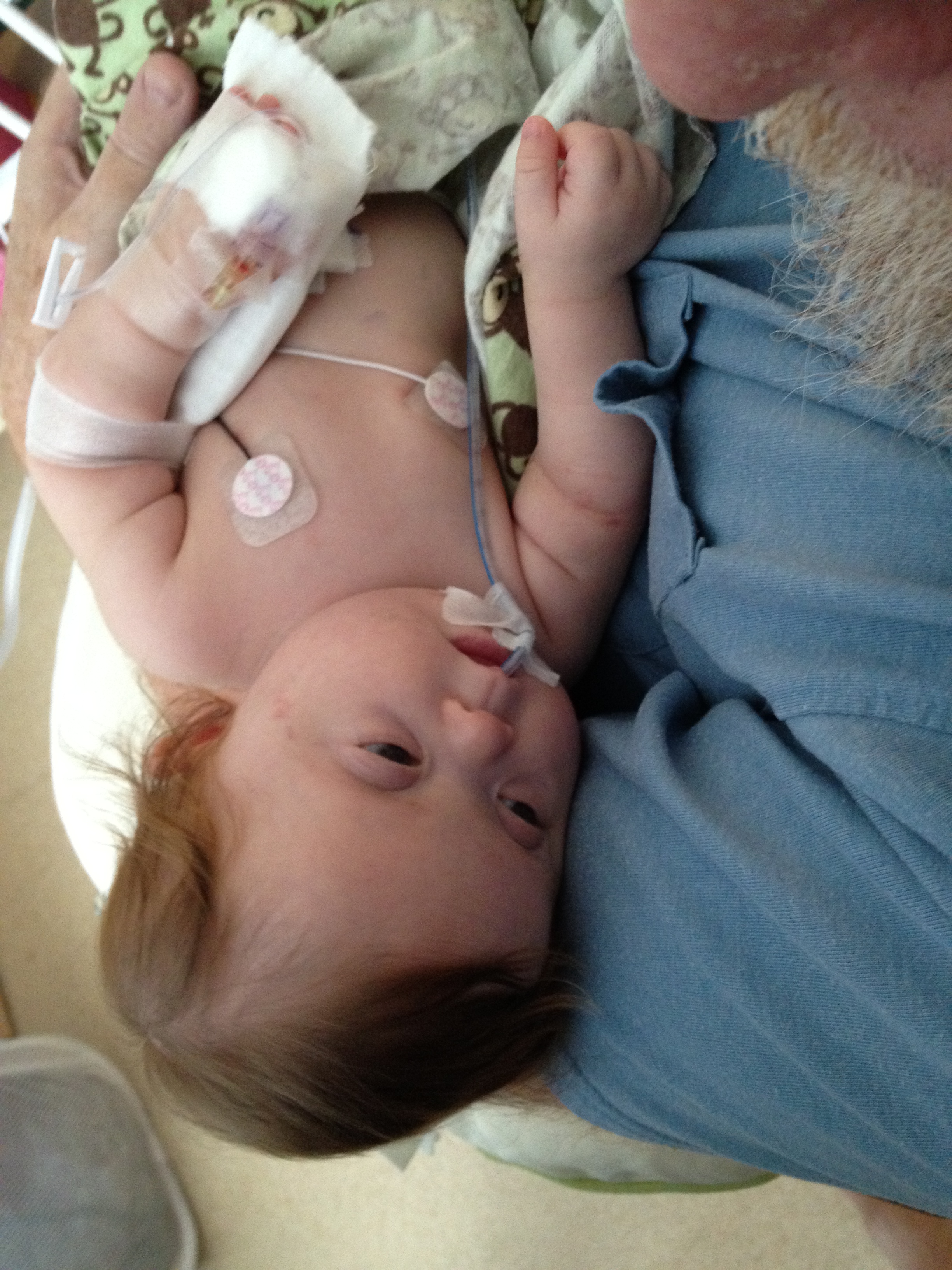 We asked earlier today if we might be able to take Leah outside for a couple of minutes just so she could experience fresh air and sunshine. The docs said no. We did get her nurses to agree to let us bring her to the pull-out couch a few feet from the crib so we could give her real tummy-time and give her some new surroundings for a little while. Mandy sat next to Leah on the pullout bed and put her on her tummy. Leah struggled for a minute and then pushed herself up – and then rolled over. Now, to be fair, Mandy was sitting on the bed so there was a slight incline in the direction that Leah rolled. But she pulled herself up onto her arms and she tipped herself over. That’s gotta be some sort of cool milestone, right? First accidental milestone? We tried to get her to do it again on video, but she had worn herself out and spent most of the remainder of her tummy time trying to eat the sheet we had laid out under her.