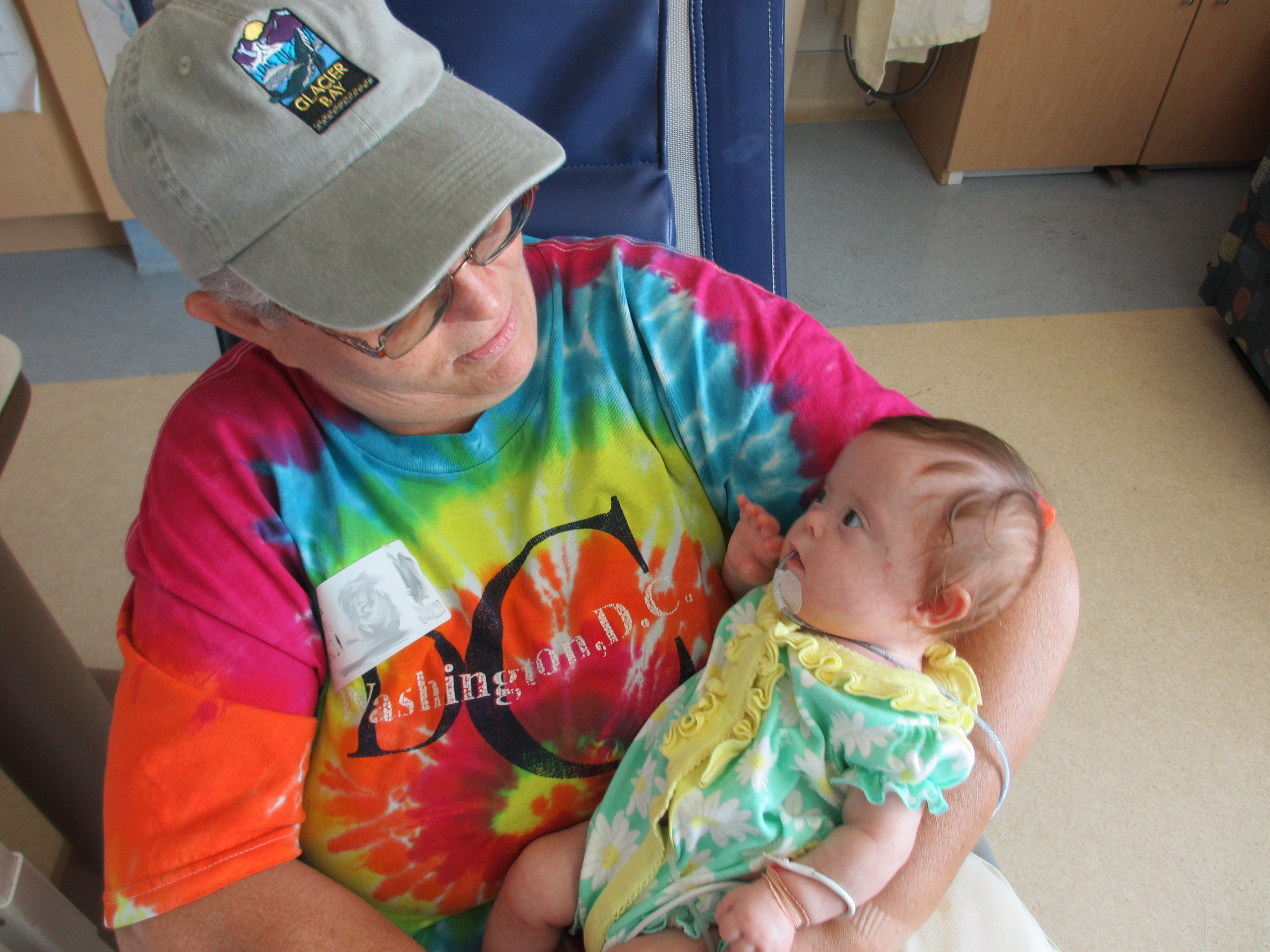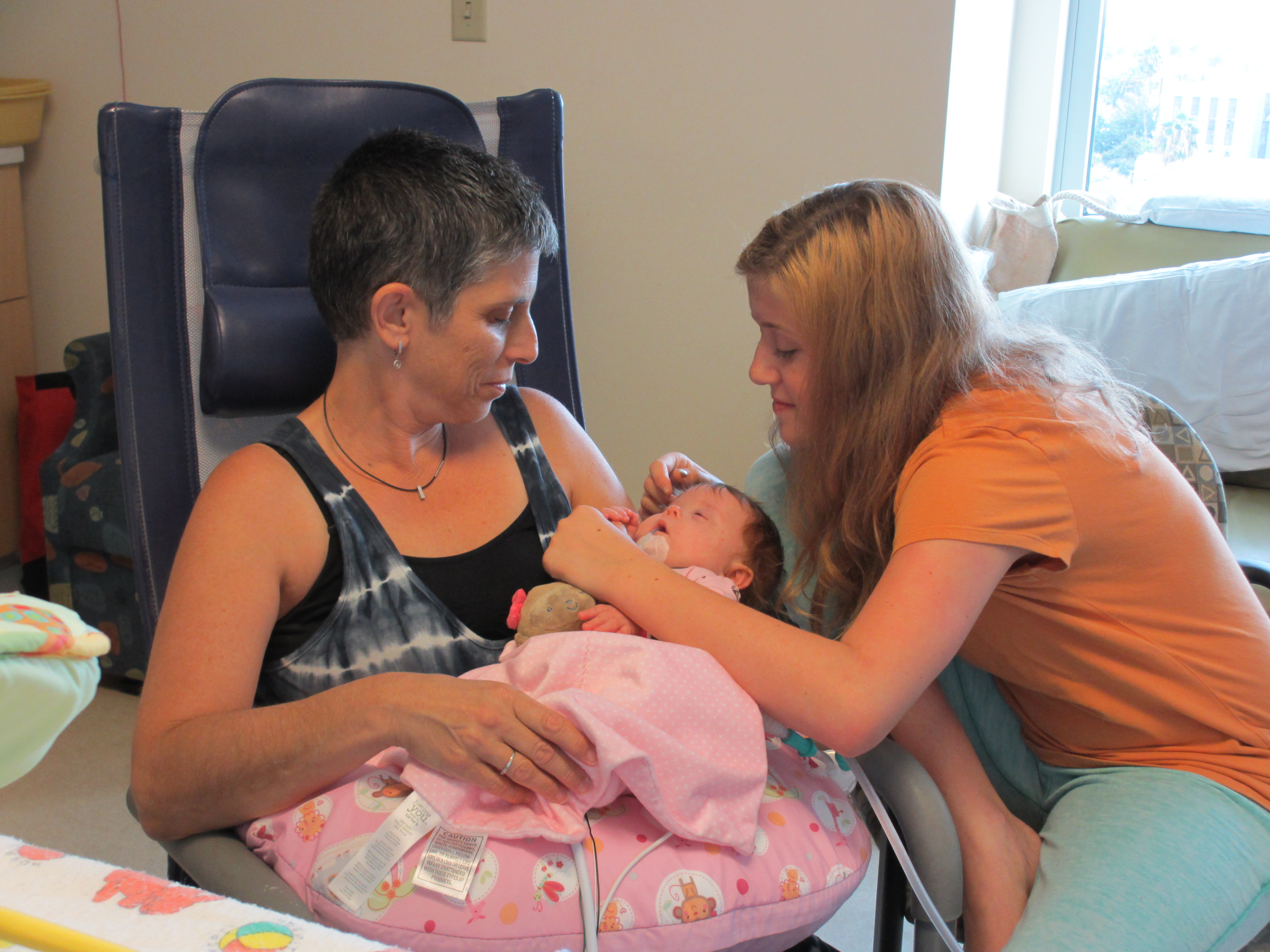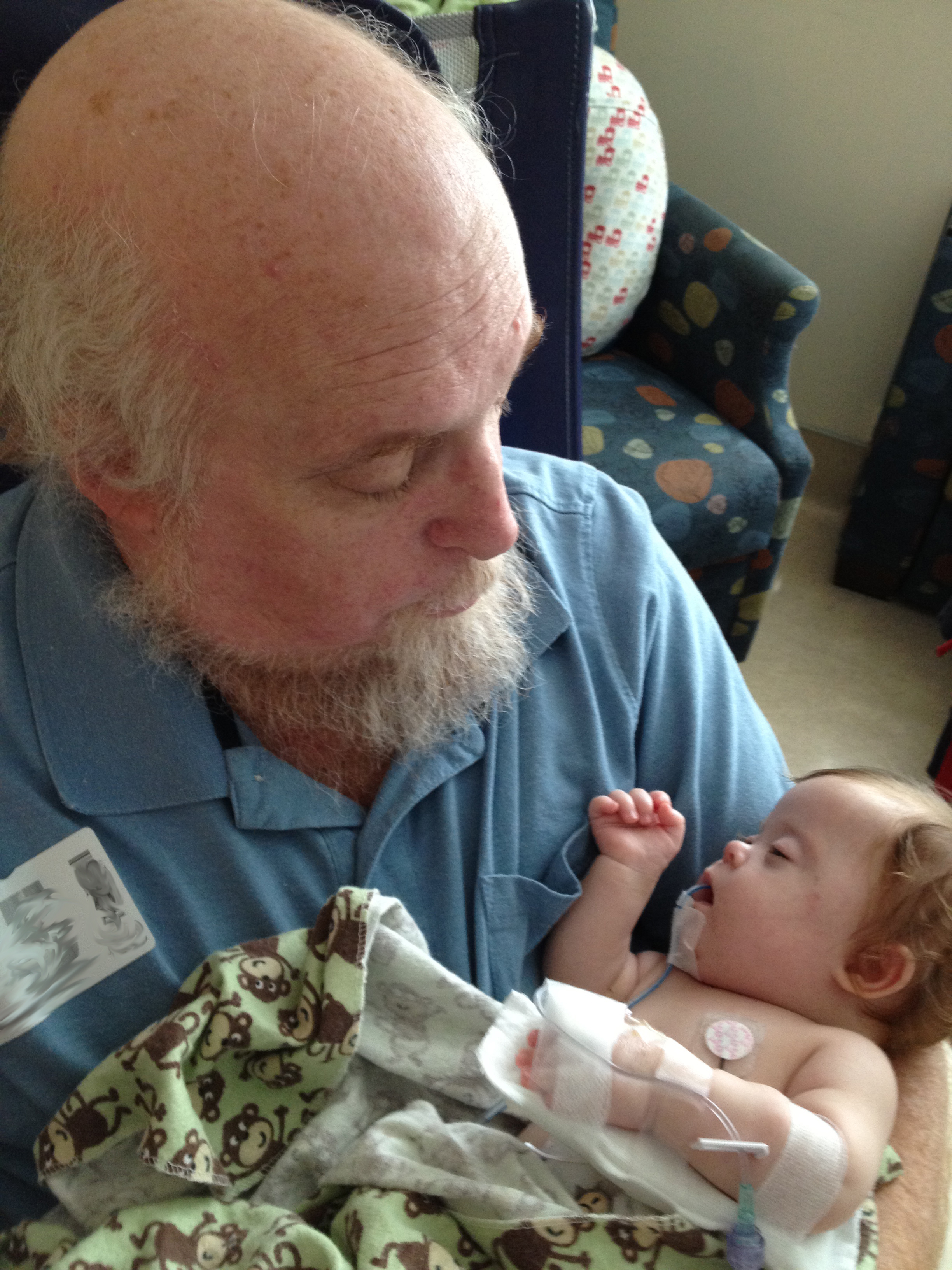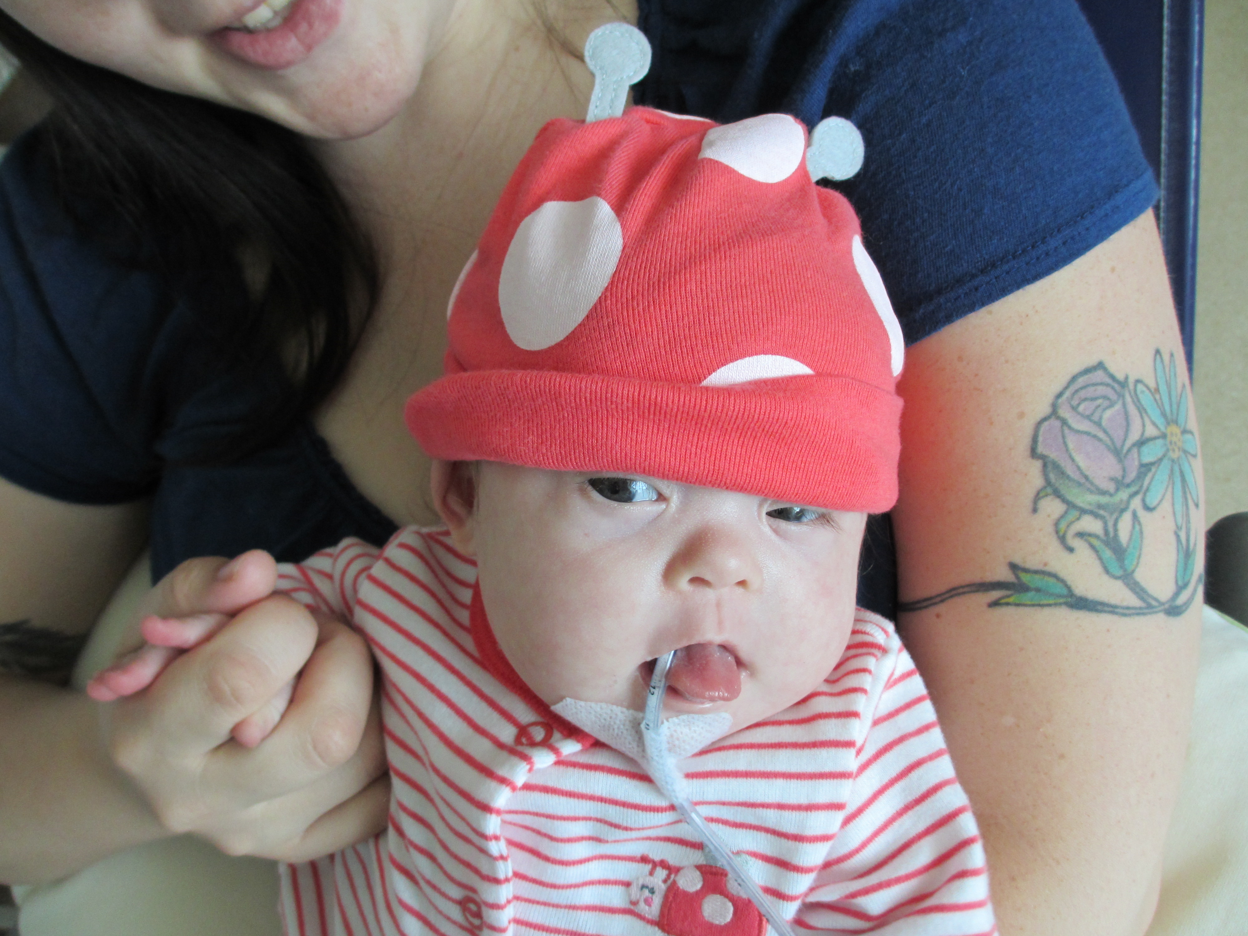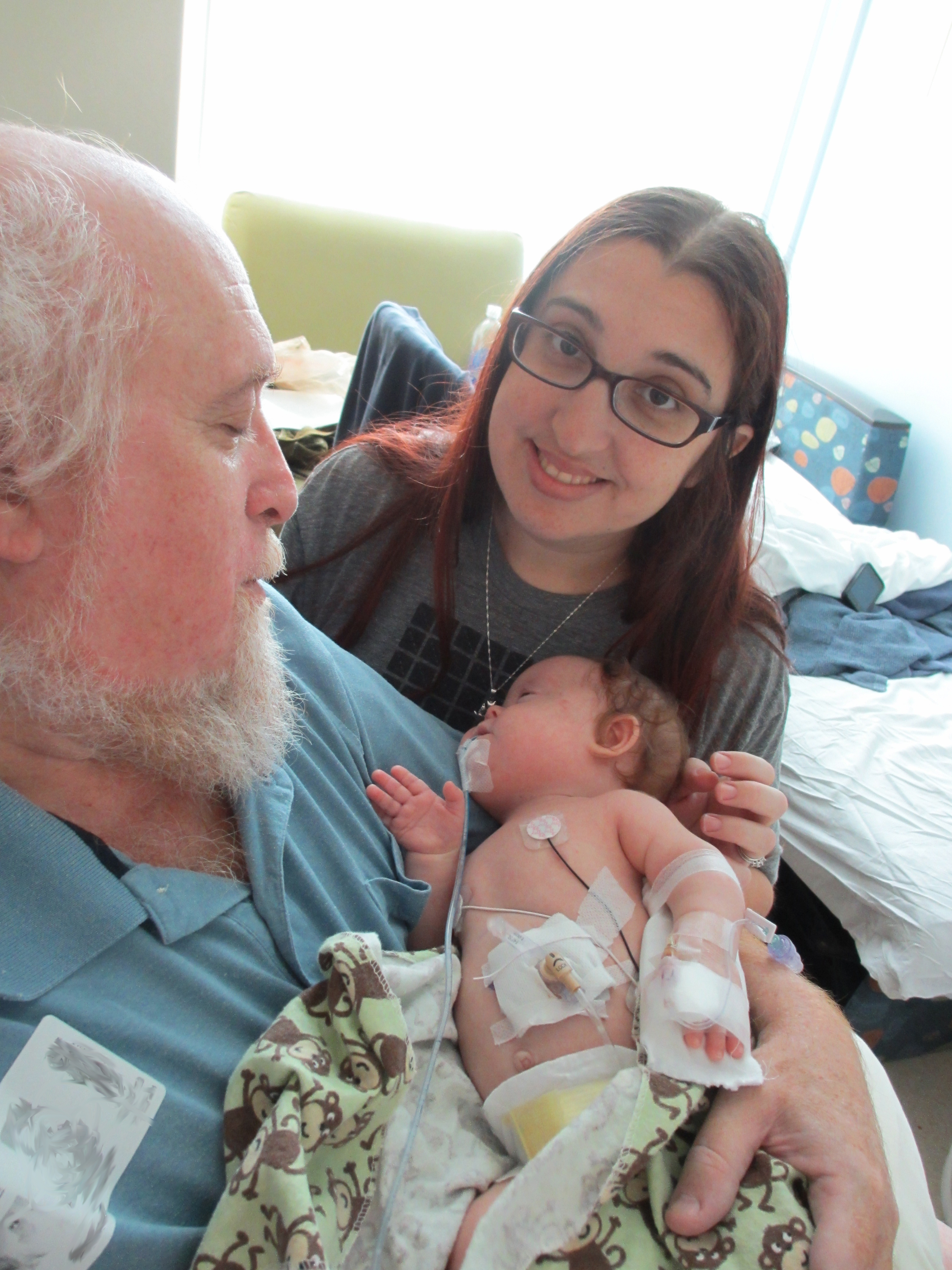 We asked earlier today if we might be able to take Leah outside for a couple of minutes just so she could experience fresh air and sunshine. The docs said no. We did get her nurses to agree to let us bring her to the pull-out couch a few feet from the crib so we could give her real tummy-time and give her some new surroundings for a little while. Mandy sat next to Leah on the pullout bed and put her on her tummy. Leah struggled for a minute and then pushed herself up – and then rolled over. Now, to be fair, Mandy was sitting on the bed so there was a slight incline in the direction that Leah rolled. But she pulled herself up onto her arms and she tipped herself over. That’s gotta be some sort of cool milestone, right? First accidental milestone? We tried to get her to do it again on video, but she had worn herself out and spent most of the remainder of her tummy time trying to eat the sheet we had laid out under her.