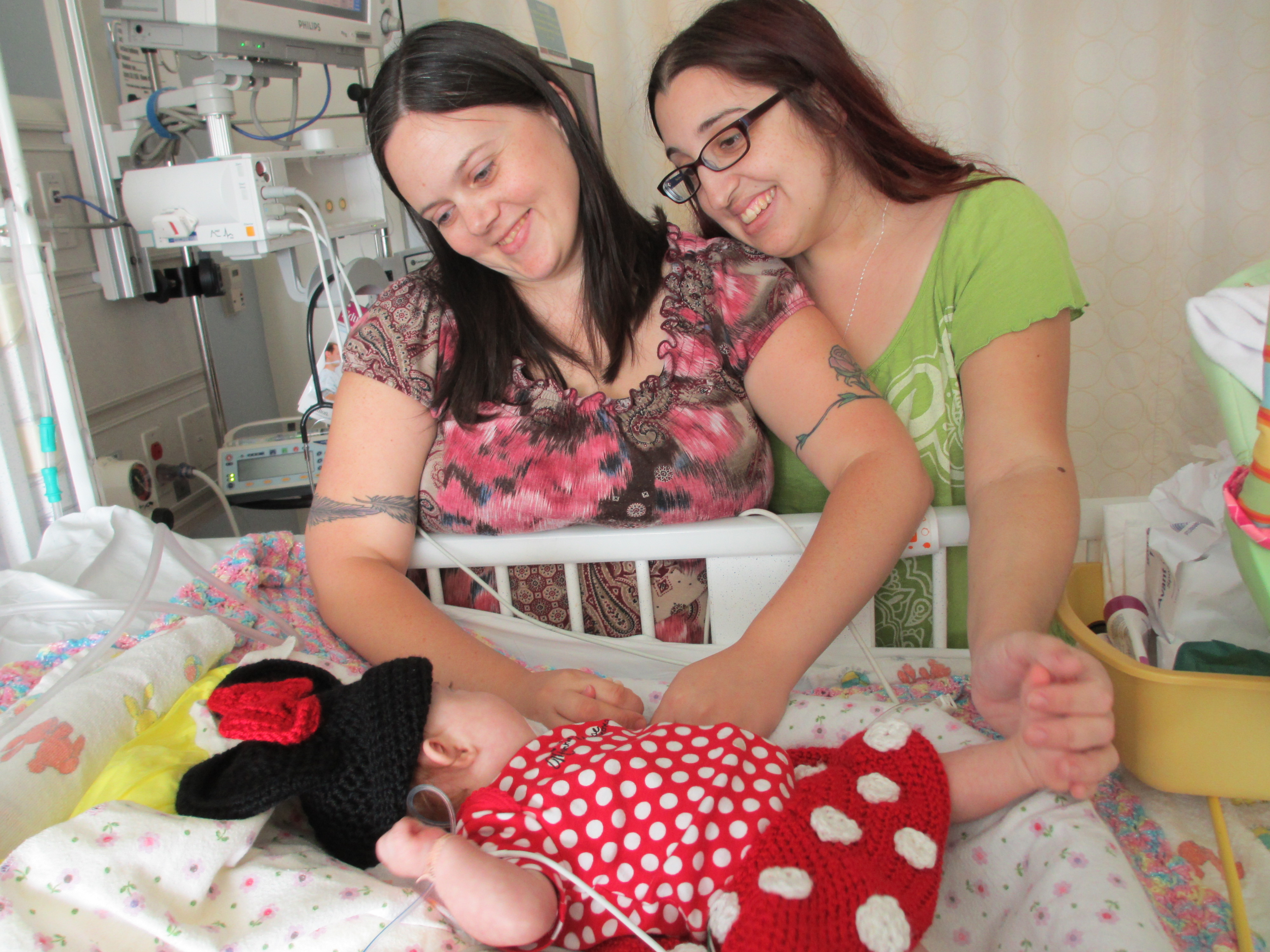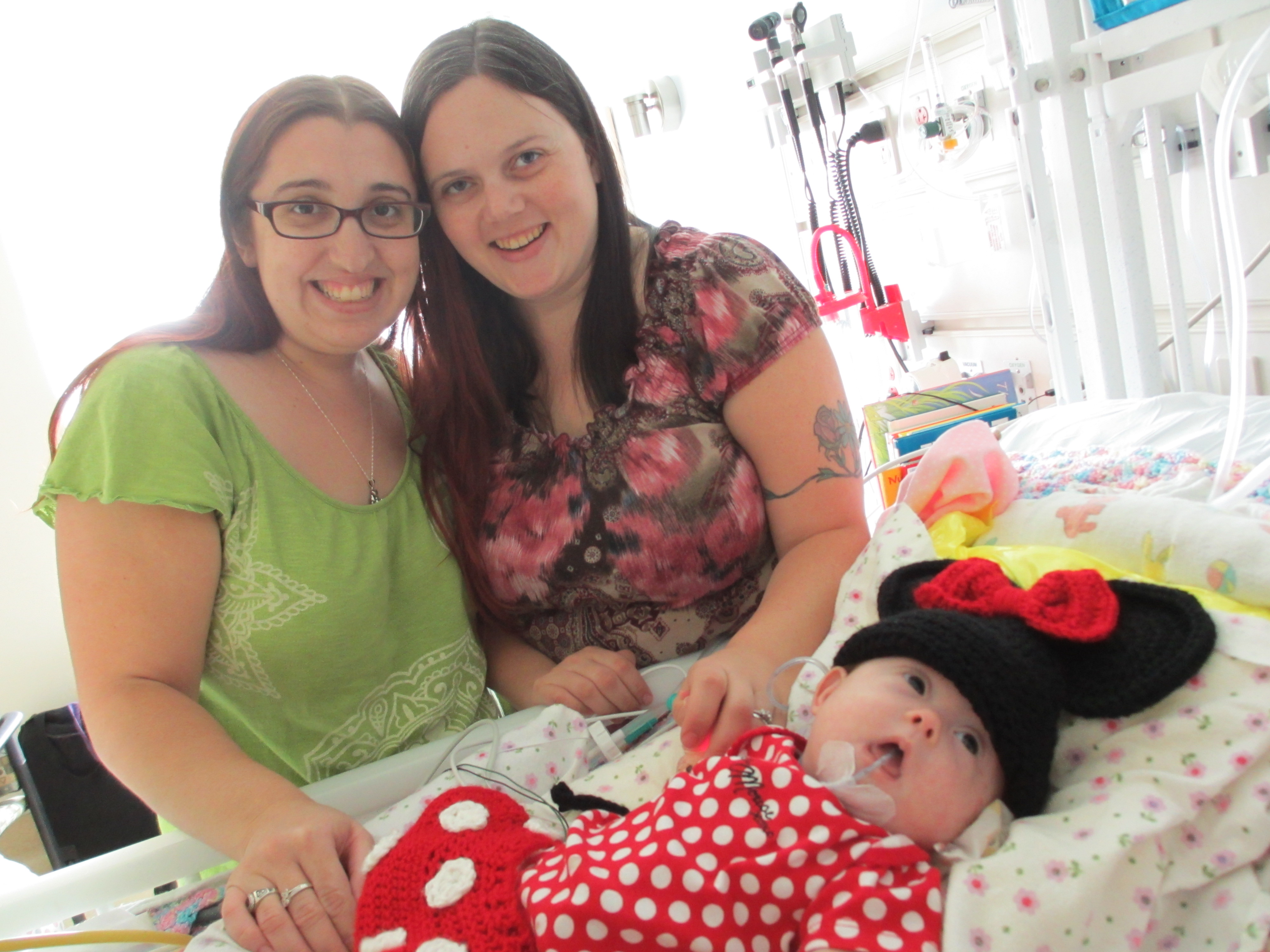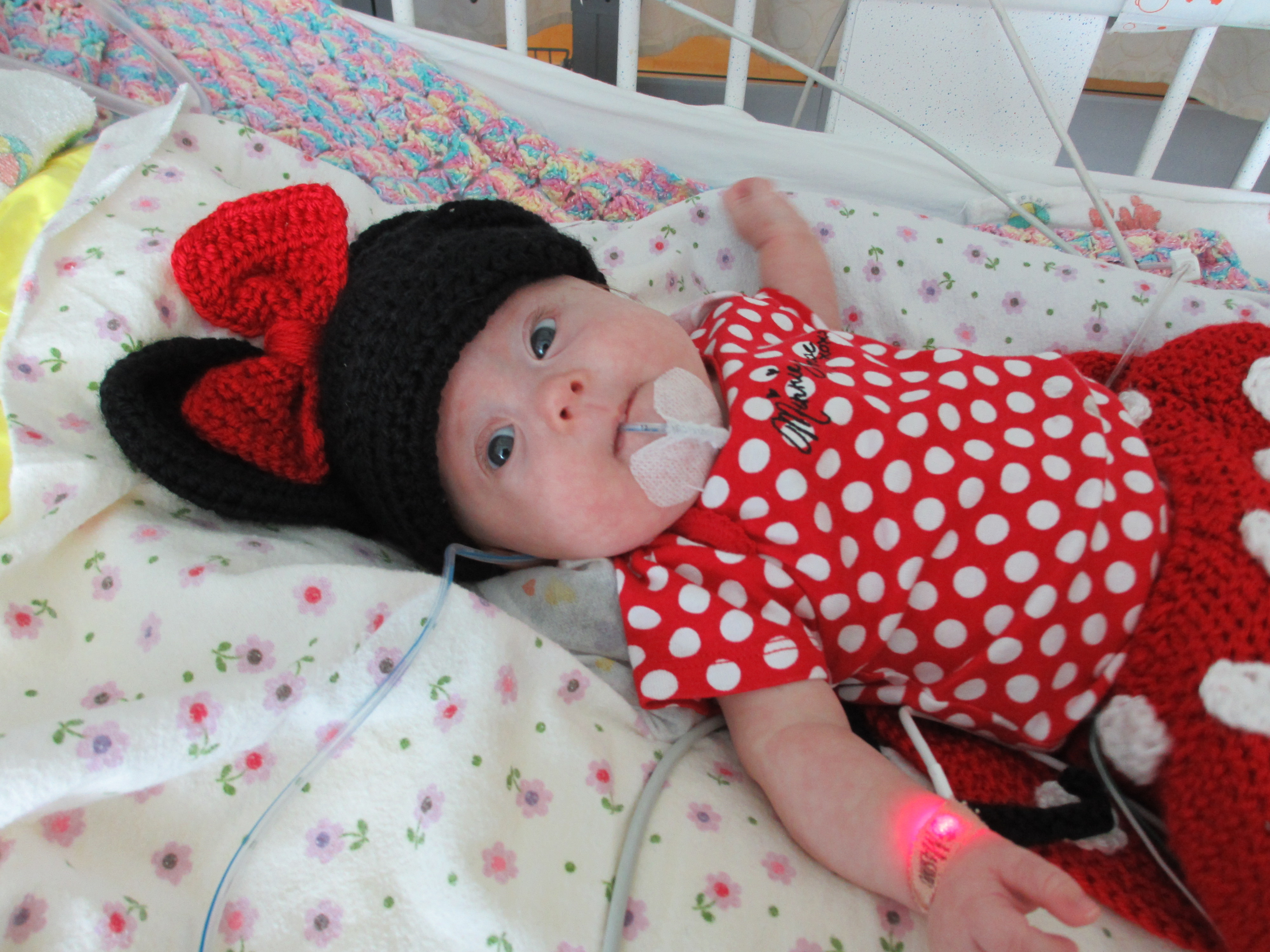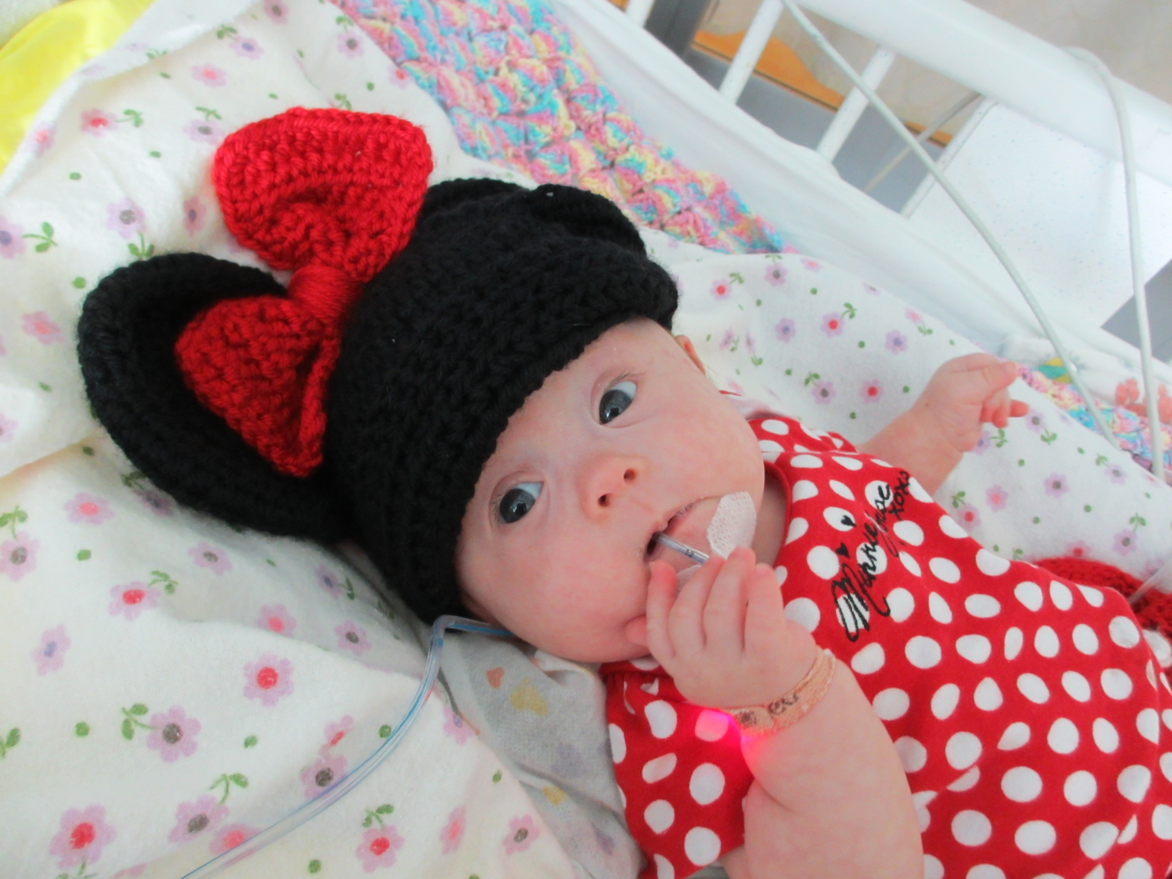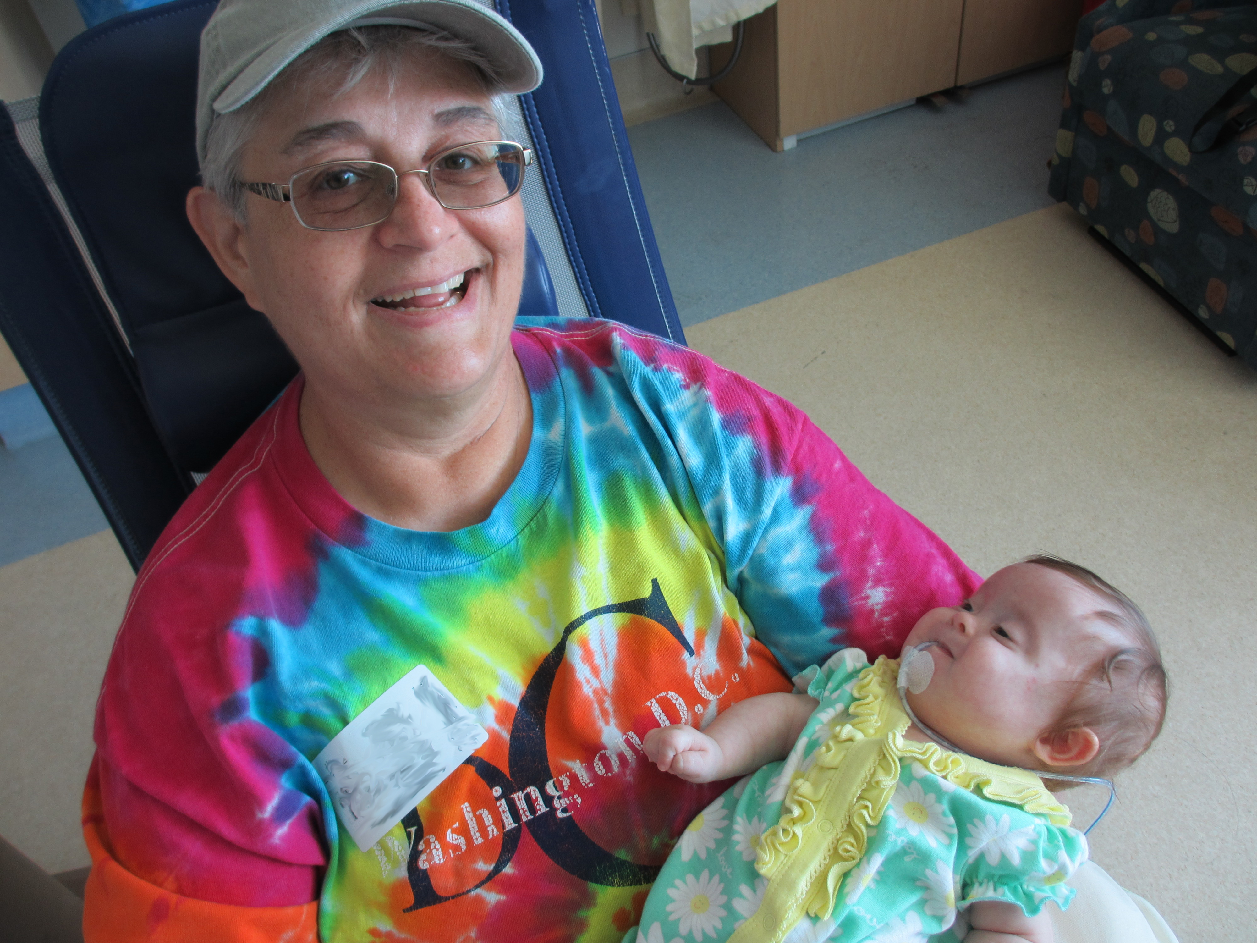 We asked earlier today if we might be able to take Leah outside for a couple of minutes just so she could experience fresh air and sunshine. The docs said no. We did get her nurses to agree to let us bring her to the pull-out couch a few feet from the crib so we could give her real tummy-time and give her some new surroundings for a little while. Mandy sat next to Leah on the pullout bed and put her on her tummy. Leah struggled for a minute and then pushed herself up – and then rolled over. Now, to be fair, Mandy was sitting on the bed so there was a slight incline in the direction that Leah rolled. But she pulled herself up onto her arms and she tipped herself over. That’s gotta be some sort of cool milestone, right? First accidental milestone? We tried to get her to do it again on video, but she had worn herself out and spent most of the remainder of her tummy time trying to eat the sheet we had laid out under her.