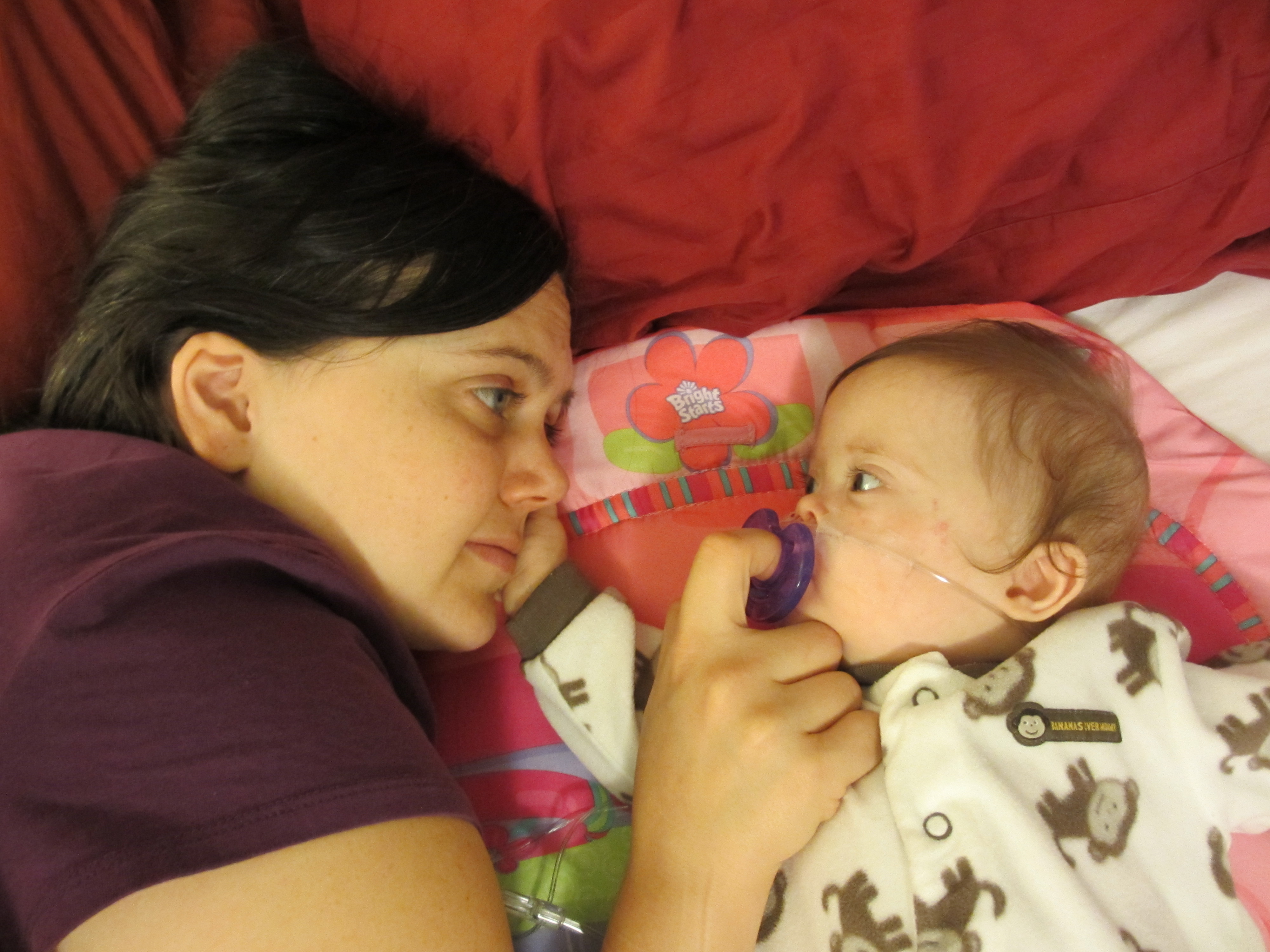 What else has been going on… Today Leah had her first doctor’s appointment since she got home. It didn’t take very long, did it? We just couldn’t stay away, I guess. I’ve been in touch with her doctor and medical equipment company all weekend. Hopefully things will calm down once we get past this transition – the move home and the weaning from methadone. Then again, after that we move into the next transition of eating by mouth. Today’s appointment was for occupational therapy. The OT attempted to give Leah a tiny bit of breast milk by bottle. It was too much for her and she got confused and upset. She wants so badly to nurse and suck, but she lacks the coordination to do it properly. She does a lot of smacking lips together and “nomming” but doesn’t get in many proper sucks. They count them. I think she did maybe three or four in a row today. We want to make sure we start feeding her by mouth while she still wants things in her mouth; I’ve had multiple parents tell me their kids developed horrible oral aversions, making oral feeds far more difficult, if not impossible.
