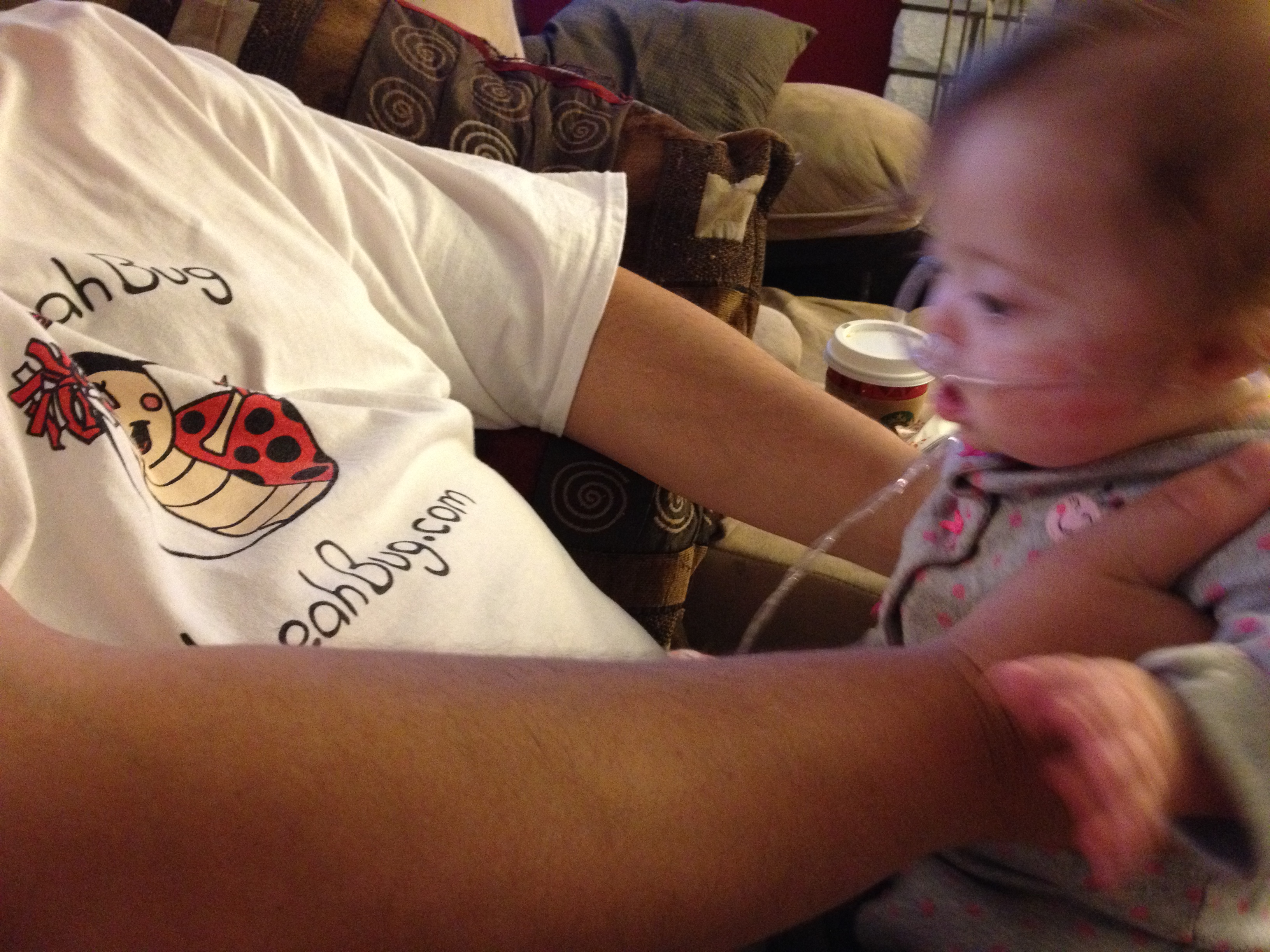 Thursday: The big day turned into a day with a big gap. The morning appointment with the ENT was simply lovely. Buggy got some yuckies sucked out of her nose, and then a big scope (not that big really, but to her it probably looked like a hose) stuck up her nose and into her throat so the doc could see her vocal cords and other nifty throat parts. Leah’s vocal cords are still a bit red, but they are moving more appropriately than they were last time, and her larynx no longer appears to be very floppy. The ENT says for the time being we can come back and see her as needed but no follow-up is necessary. YAY! The OT appointment got cancelled at the last minute (not sure why) so we wound up with a 3.5-hour gap between appointments. So Gran and Mama and BabyBug went to Starbucks. Oh yeah. Baby had her first Starbucks trip and it was grand. Or maybe grande. Leah was very well-behaved, and even got in a little bit of a nap. We did have one, um, “incident” in which Mama Lisa adjusted the nasal cannula so that the tips pointed in the right direction (into her nose), and BabyBug responded by casually putting her hand up to her nose – and ripping the cannula right off her face. She thought this was absolutely hilarious. I got big smiles. She was very, very proud of herself. After Starbucks Leah had her pulmonology appointment. BTW, Leah weighs about 11 lbs, 4.5 oz. Could be better, could be worse. She pulled off her cannula AGAIN at the office, so we just left it off while we waited to see the doc. He approved our request to have her only be on oxygen while she is sleeping, although we really need to get a pulse oximeter so we can keep an eye on her saturation levels. She is due to have a sleep study within the next few months, but he said that based on what he has observed, he thinks it will likely come out abnormal. So we’ll likely be dealing with that in the coming months.