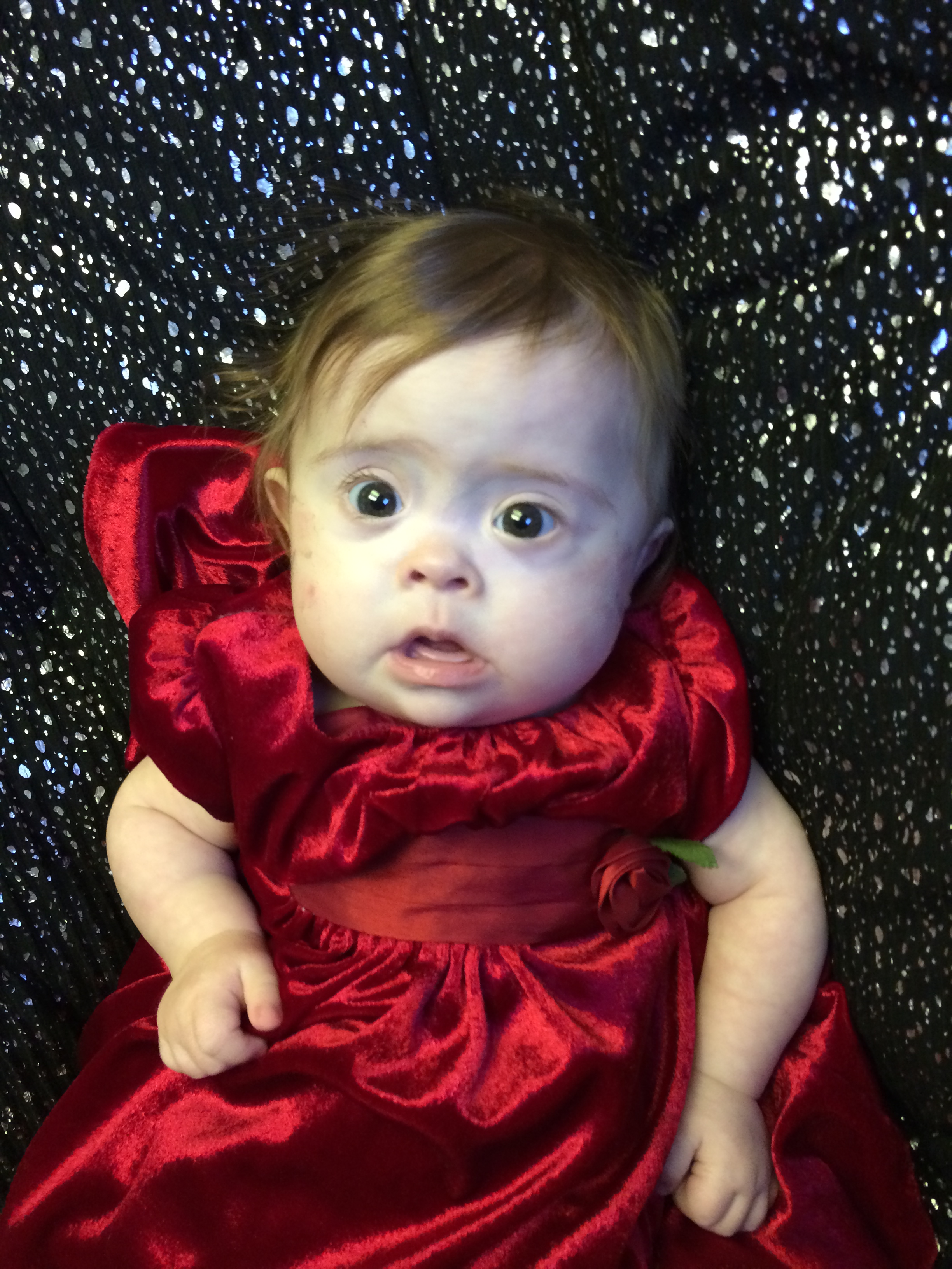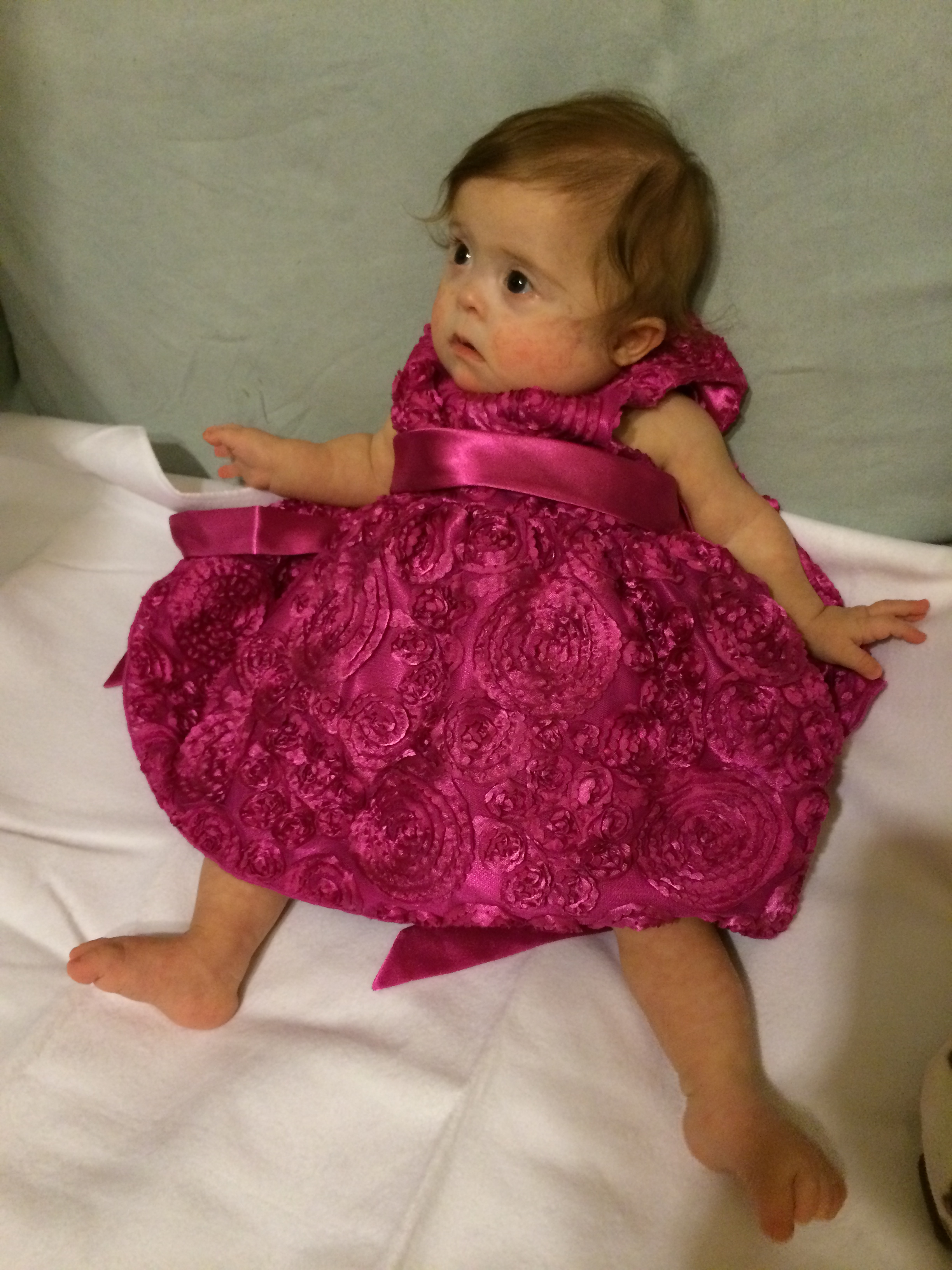 “Really, Mama?” Tonight we had our annual holiday get-together with cousins Beth, Brian and Erin and some additional family/friends, in place of the Christmas Eve we usually spend with them. BabyBug got all dolled up in a dress that was a gift from Beth and Cool Auntie Erin. Leah had lots of fun, but I think she’d have been happier wearing a onesie. It’s not so much that she doesn’t enjoy dresses in particular – it’s that she doesn’t like anything that is bulky or particularly complicated to put on, e.g. jeans, ruffly dresses, overalls, t-shirts – really anything aside from front-snapping onesies that don’t require anything to go over the head. On the other hand, she does seem to reserve some of her very best angry faces for the frilliest outfits…