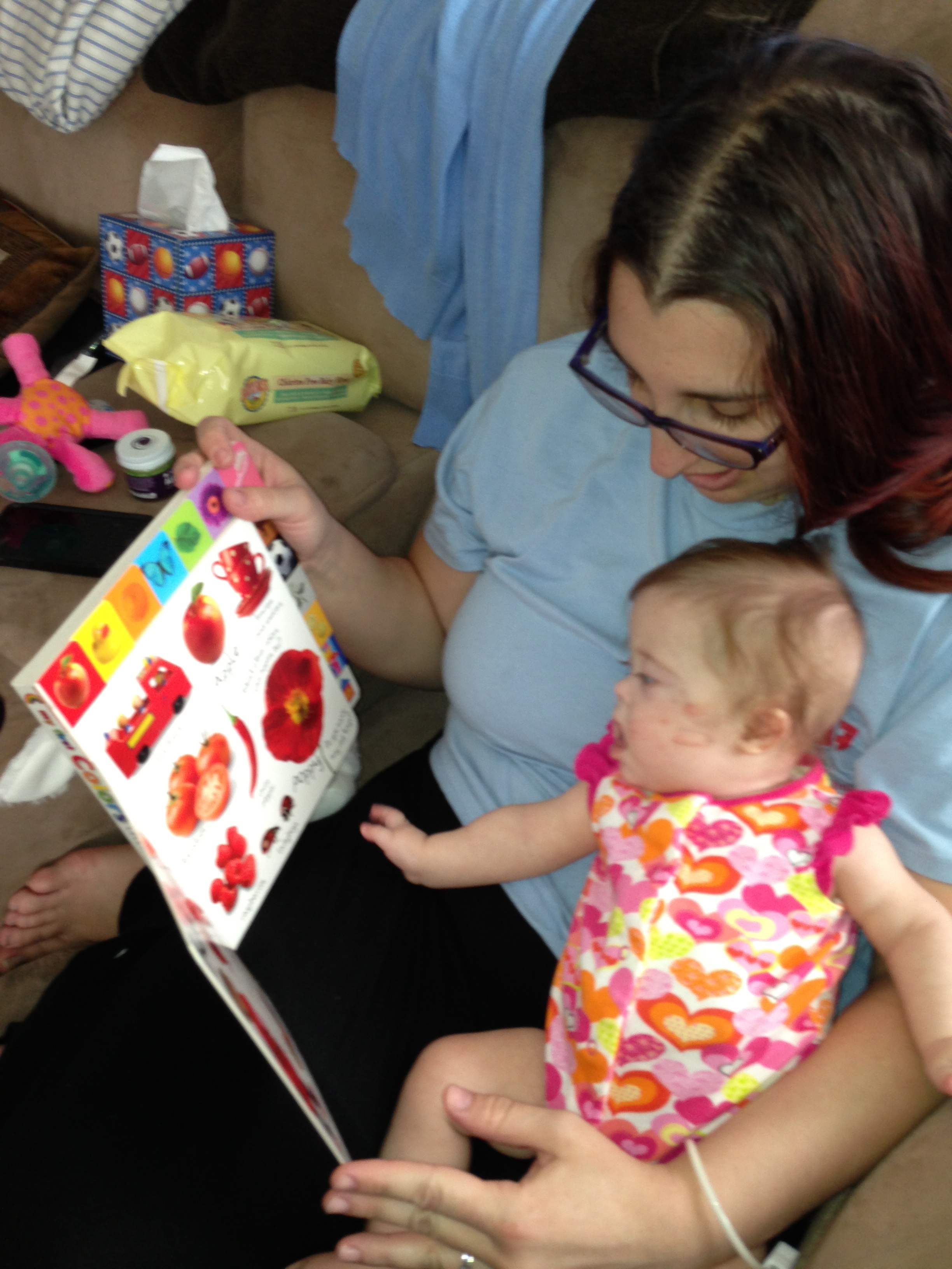 Aunti Staci reads a book to BabyBug while Mama packs