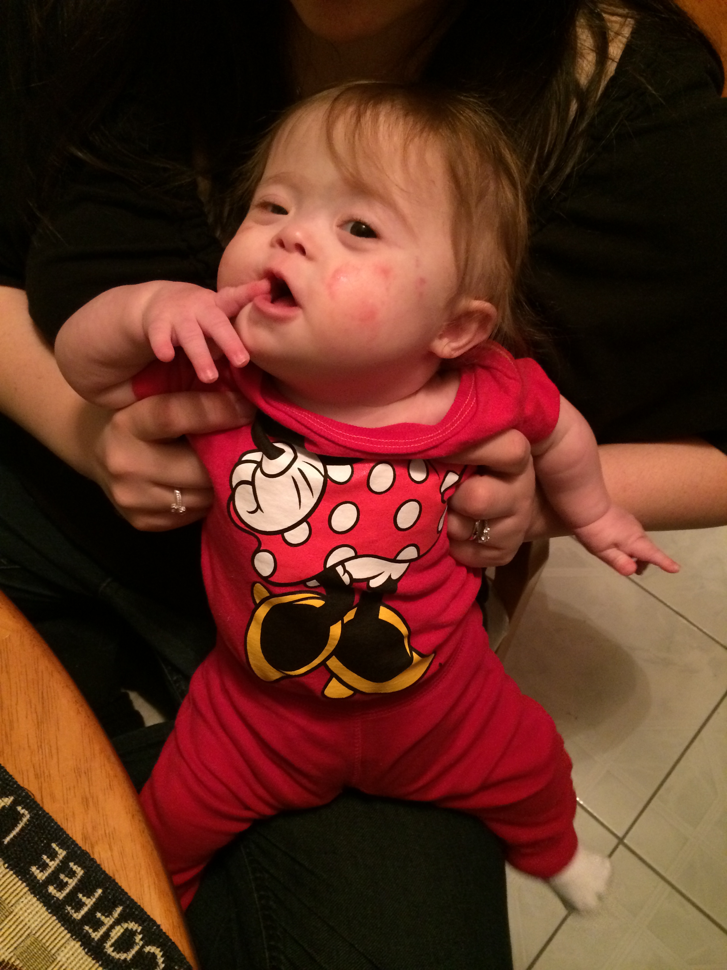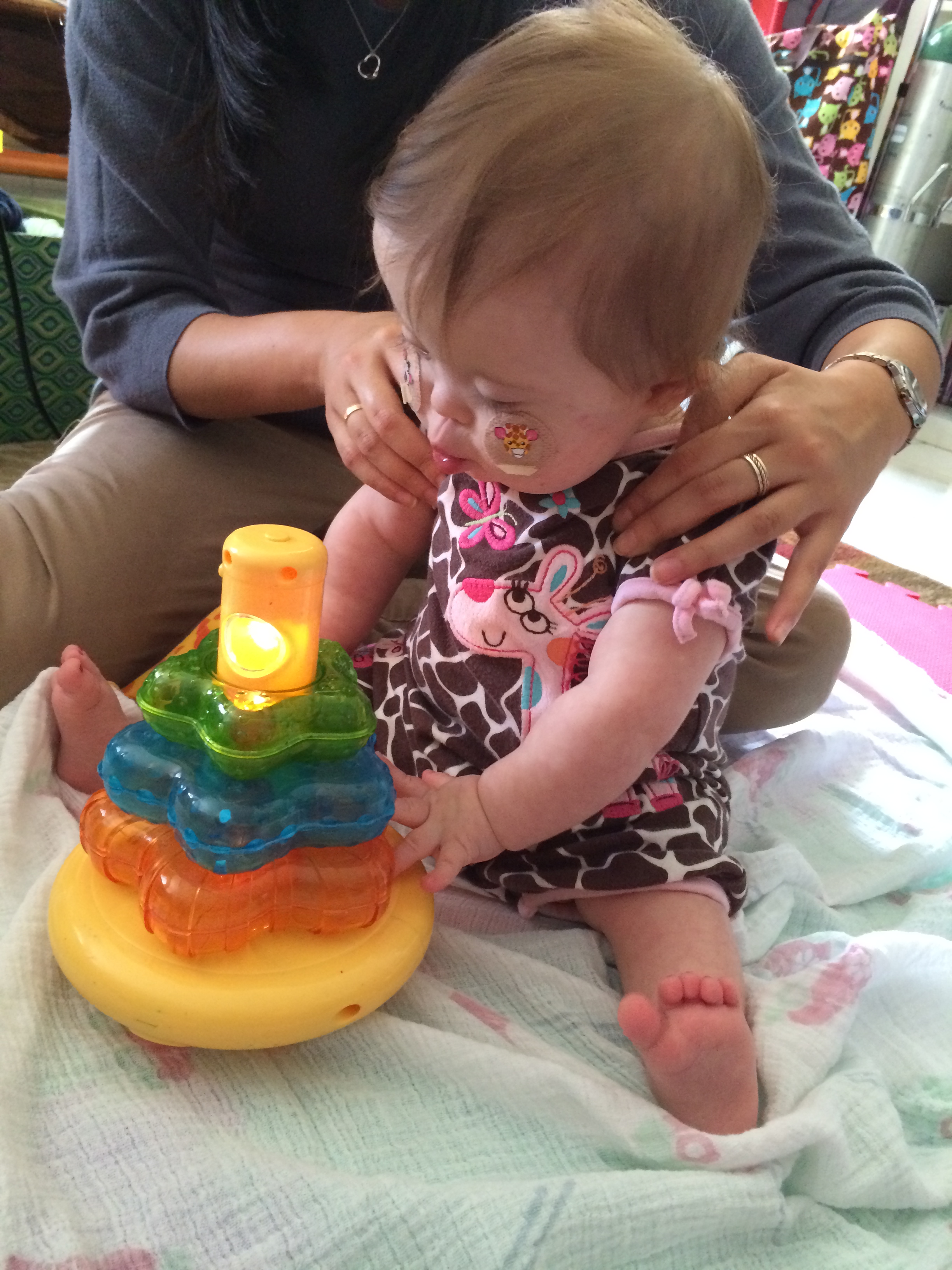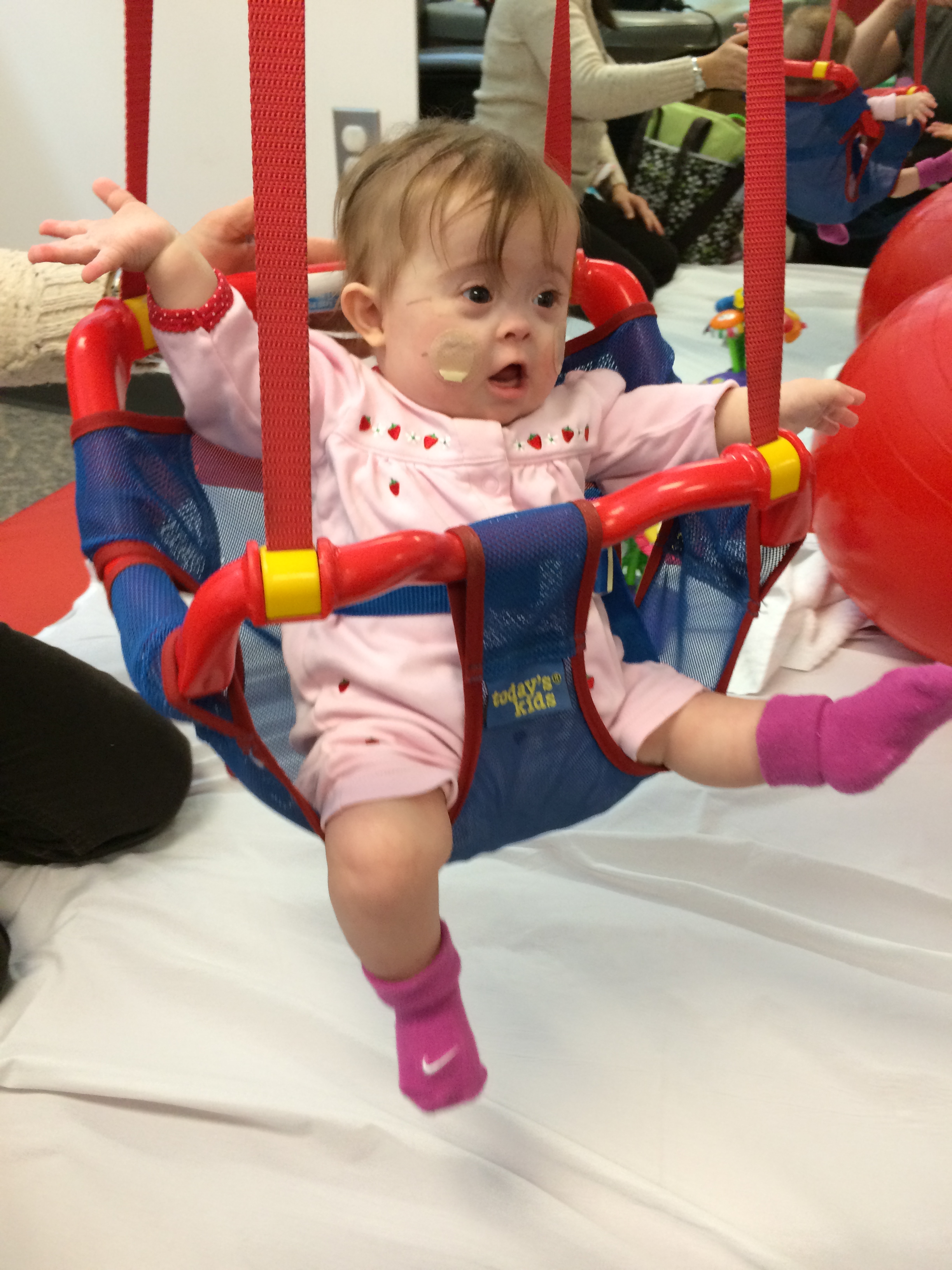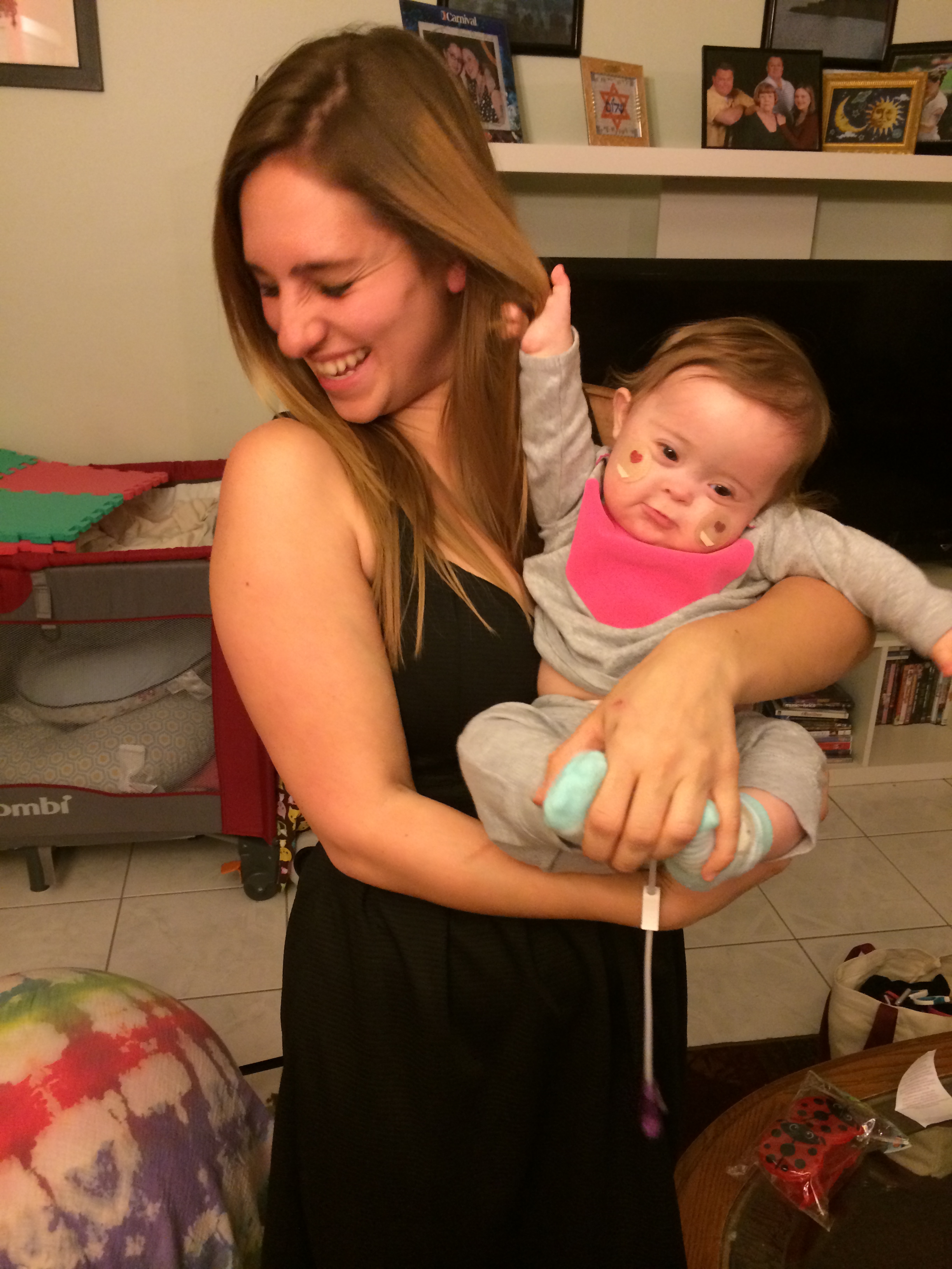 During our visit, Leah’s speech pathologist assessed her for non-swallowing speech services and found that she does qualify for speech therapy, so she is going to set some goals. Leah is so expressive that I think sometimes people don’t see her receptive language issues until we really point them out (which is funny, because from what I’ve been reading, in older kids with T21, it’s usually the other way around!). She doesn’t respond to sounds by looking for them or even responding to them, at least not until the source gets into her line of sight. I don’t think it is her hearing, though of course I could be wrong. She will be assessed again in the near future, I’m sure. I think that she learned to tune things out during her nearly 7 months in ICU, and now needs to be taught how to attend to sounds that are important. When Mandy came home the other day, she talked to Leah from the other room before she came into the living room, and Leah had no reaction – until she saw her Mommy, and then she was pleased as punch. Hopefully this is something we can work on.