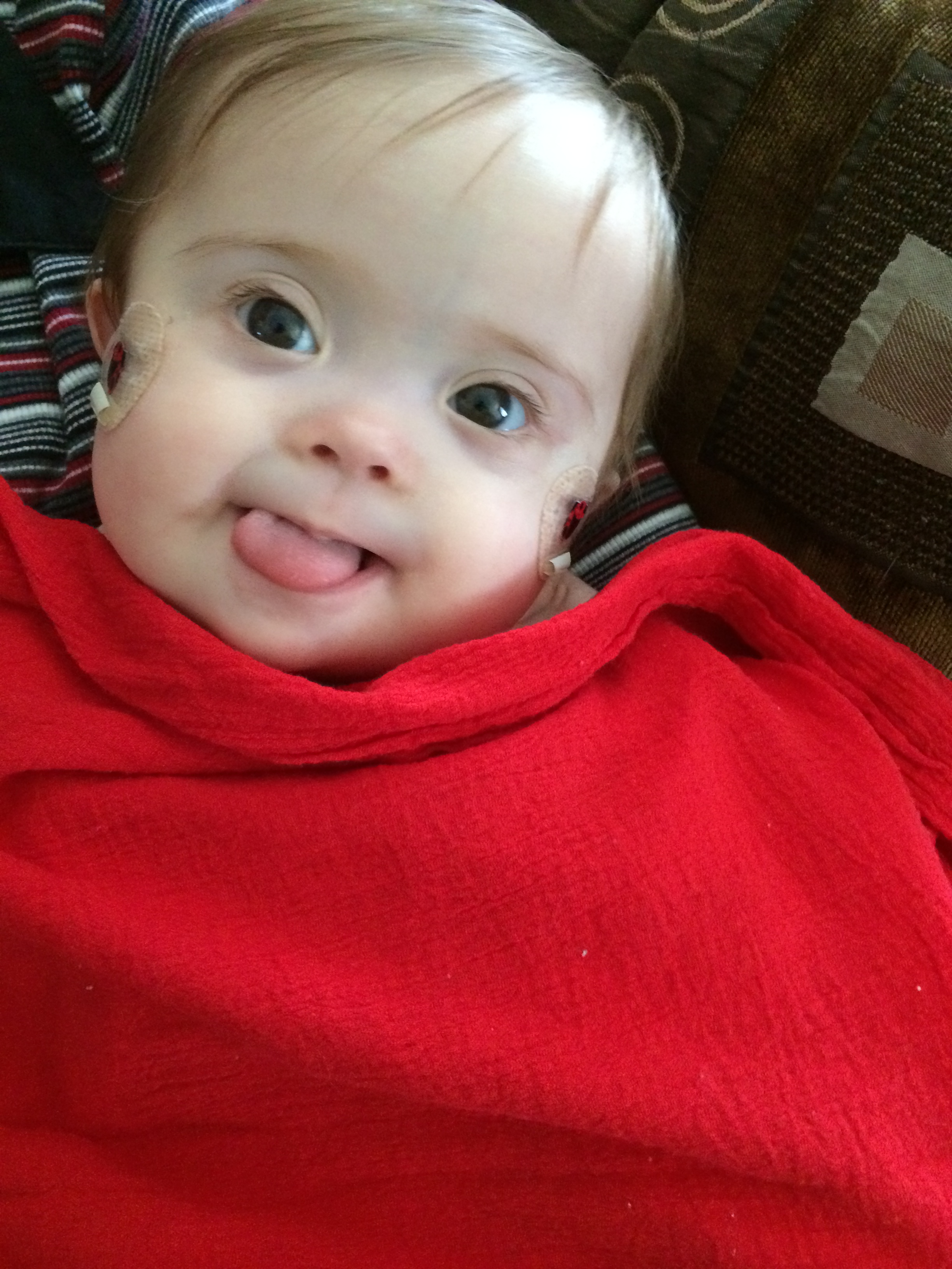 SuperBug all ready to fly off to surgery. This picture brought us incredible support during Leah’s surgery. The Special Miracles – Down Syndrome page shared her photo and roughly 18,500 people liked it on their page. A little over 800 people shared it on their own walls. Another 13,700 saw the picture through Leah’s Facebook page. The Butterfly Fund, the org that so generously shared Leah’s wishlist, also posted it and over 600 people liked it. This means that at minimum, almost 33,000 people saw the photo, not counting the friends of the folks who shared it. It received well over 1,000 comments wishing Leah good luck and sending her positive thoughts and prayers. These numbers just completely blew us away. We’re grateful for the continued support of our family, friends and community, and also amazed at how many people cared enough to take a moment out of their day to send good wishes to a baby they don’t even know. The constant flow of positive energy really kept me sane during Leah’s surgery and later when she was sleeping off the pain. I know she felt it too.