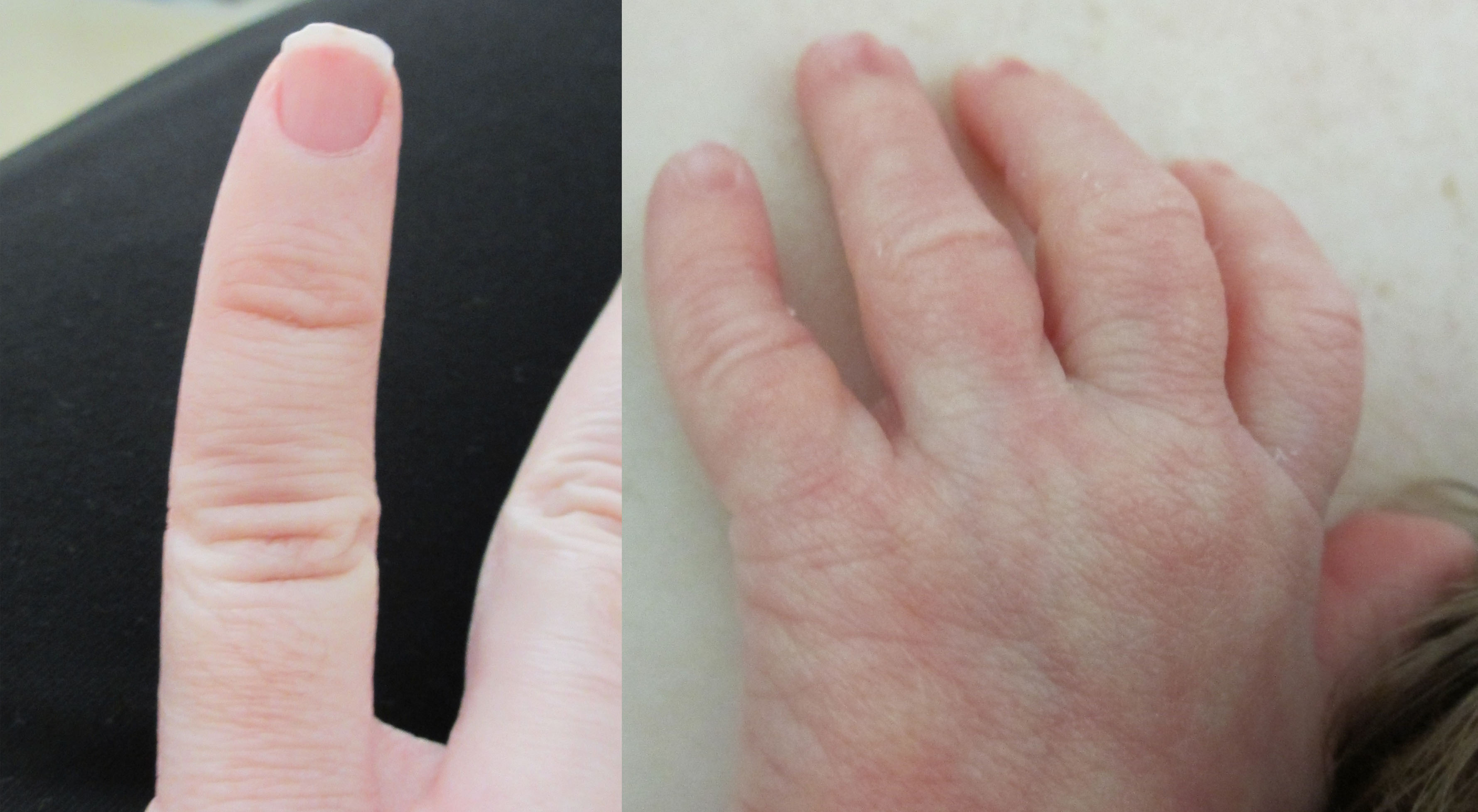 Random thought: Frequently children with Down Syndrome have pinky fingers that look a little different, e.g. bent or hooked. In this case, though, I can’t tell whether Leah’s cute little bent pinky is a product of her Down Syndrome or her genetics – my pinkies are bent too! Go figure.